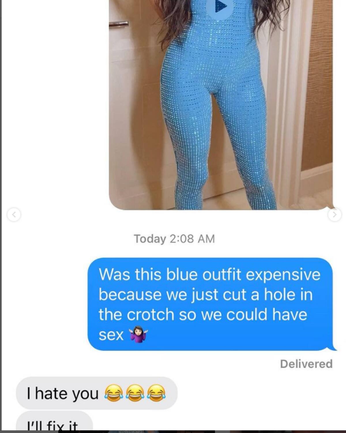 “¿Este outfit azul es caro?, porque acabo de cortarle un hoyo en la entrepierna para poder tener sexo”, escribió la actriz en su mensaje. “Te odio, yo lo arreglaré”, le respondió el diseñador.