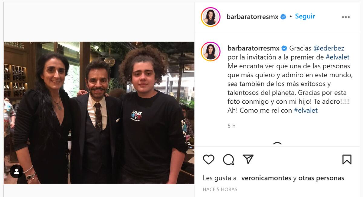 Gracias Eugenio Derbez por la invitación a la premier de #elvalet Me encanta ver que una de las personas que más quiero y admiro en este mundo, sea también de los más exitosos y talentosos del planeta. ¡Gracias por esta foto conmigo y con mi hijo! Te adoro!!!!! Ah! Como me reí con El Valet.”,