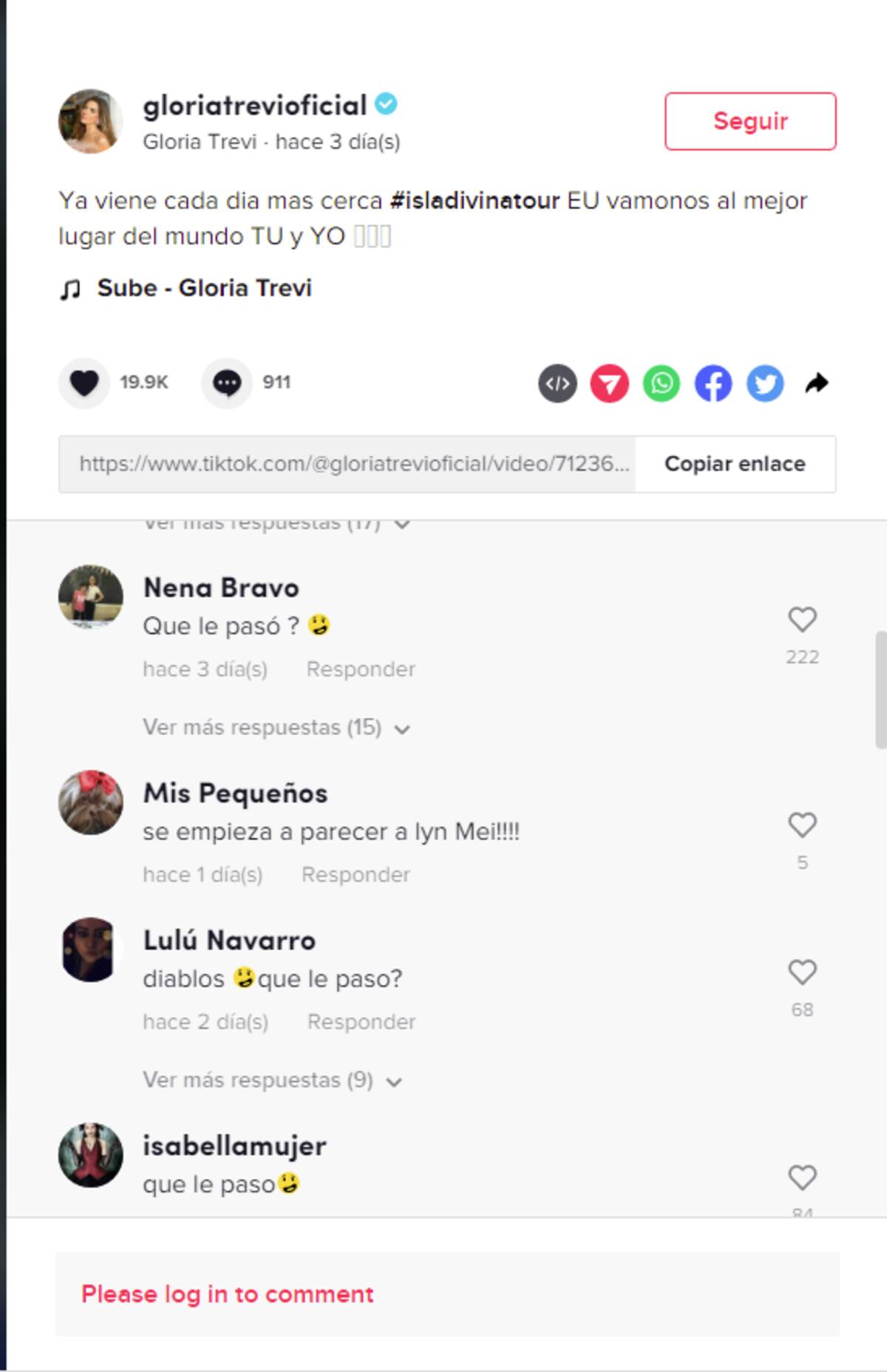 "Parece la caricatura de Gloria Trevi", "¿Qué le pasó0?", "No la reconocí", "Su cara, ¿qué le pasó?", "¿Si es Gloria Trevi?, no se parece", "Por Dios, ¿Qué se hizo?", "Pensé que era Meche Carreño", "Ah caray, el tiempo y el botox", son sólo algunos de los comentarios que pueden leerse.