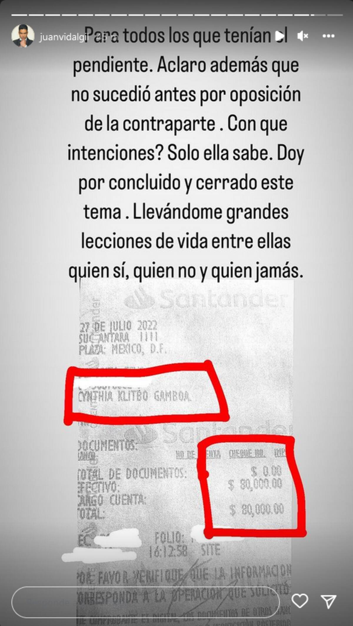 Ciudad de México.- Tras la polémica sobre una deuda entre Juan Vidal y su ex pareja Cynthia Klitbo, el actor subió un comprobante de pago en redes que liquidaría el préstamo.