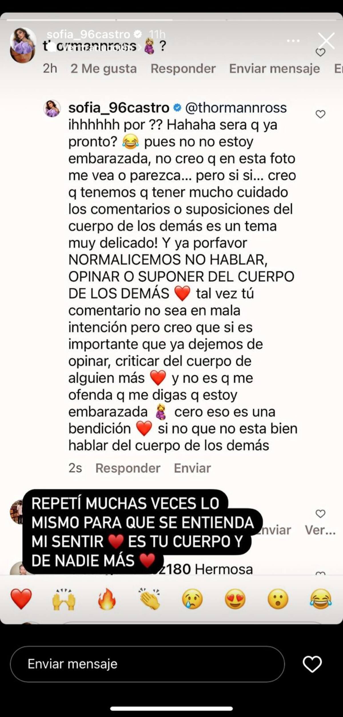 Sofía Castro por su parte dejó en claro que no estaba embarazada y descartó que en la imagen se le notara algo así, además invitó a los usuarios limiters a de opinar o comentar suposiciones al hablar del cuerpo de alguien más.