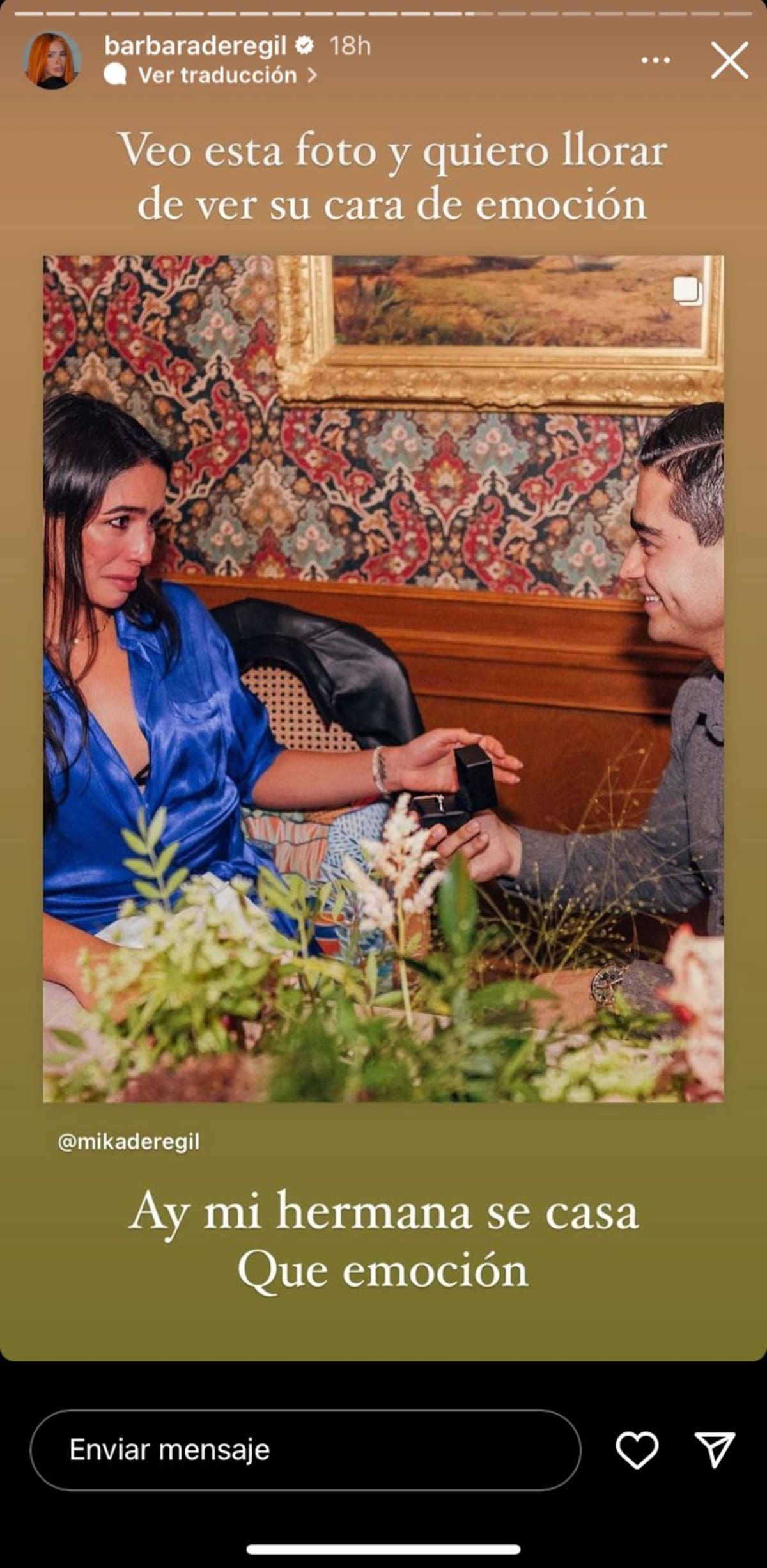 Bárbara compartió la publicación del momento donde su cuñado Jacobo Bachrach quien se arrodillo para sorprende a Mika y en una emotiva cena de un restaurante de lujo en Barcelona le preguntó si deseaba pasar su vida a su lado.