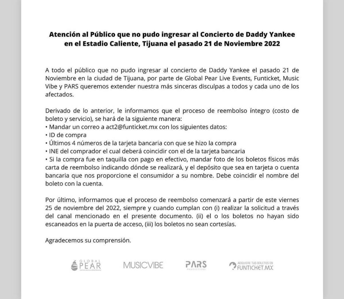 Tijuana, Baja California.- La empresa Funticket, Music Vibe, Global Pear Live Events y Pars se pronunciaron sobre los hechos ocurridos el pasado 21 de noviembre cuando miles de fanáticos de Daddy Yankee se quedaron afuera del Estadio Caliente en Tijuana y aseguraron habrá reembolso íntegro de su dinero.