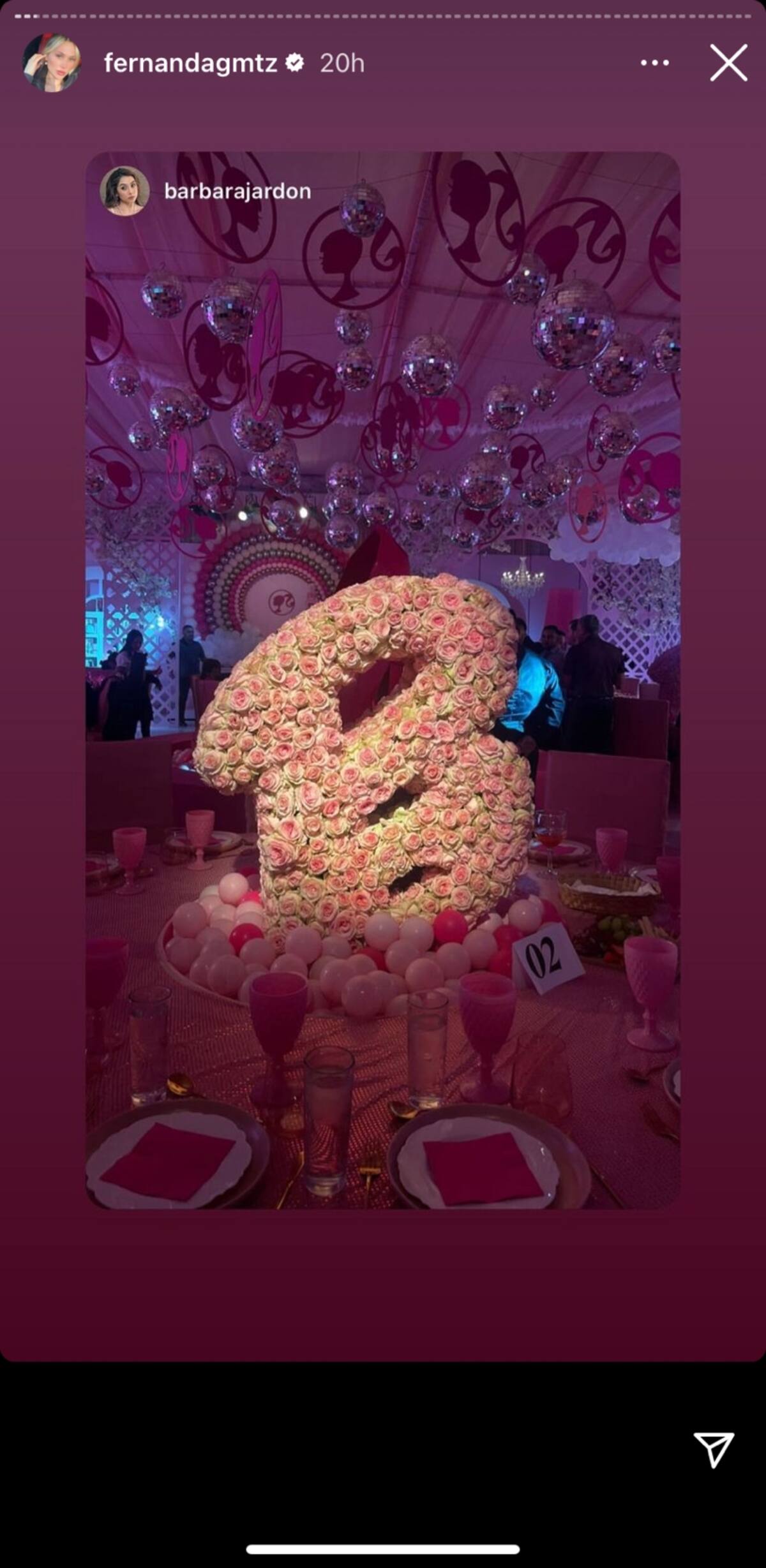En una de las grabaciones se puede ver que en esta ocasión la temática del festejo fue de Barbie, es por eso que María Fernanda llegó en una limosina tipo Hummer de color rosa, acompañada de “Barbies humanas”, quienes fueron las que la acompañaron toda la tarde.