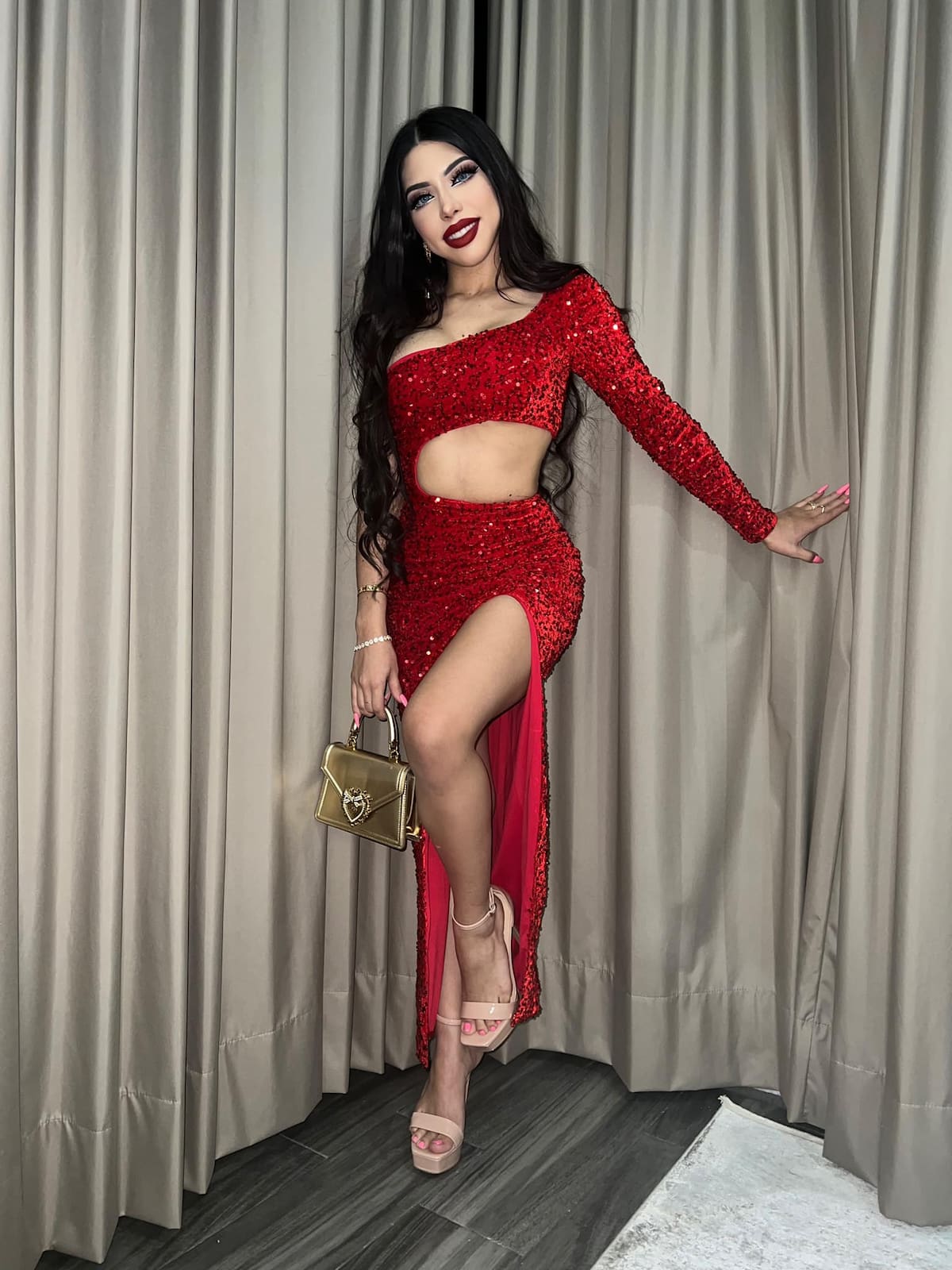 La influencer de 20 años presumió su cuerpo en un entallado vestido rojo de lentejuelas con corte cut out en un costado. Yeri también apostó por este tono en sus labios y lo acompaño con unos tacones beige.