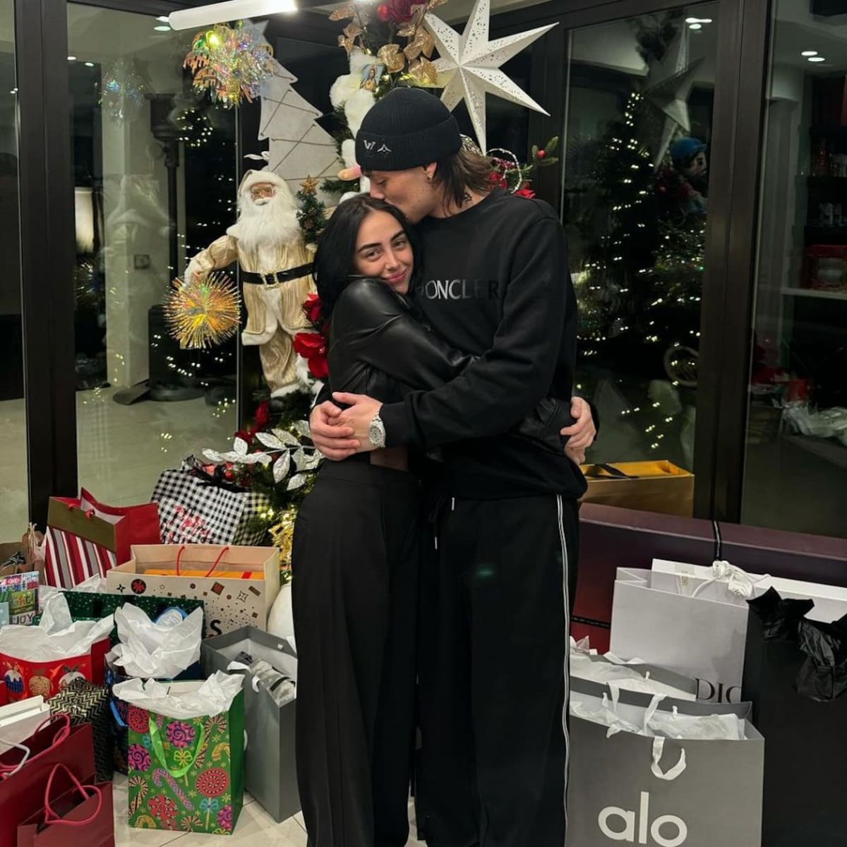 No podía faltar la clásica foto con el árbol de Navidad que Peso Pluma y Nicki Nicole se tomaron. Debajo del adorno navideño se alcanzan a ver bolsas de regalos de tiendas como Dior o Alo.