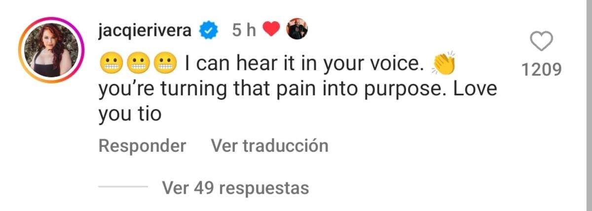 Jacqie Rivera, hija de Jenni Rivera, expresó su apoyo a Lupillo en los comentarios, en donde expresó: “lo puedo escuchar en tu voz. Estás convirtiendo tu dolor en un propósito. Te amo, tío”.