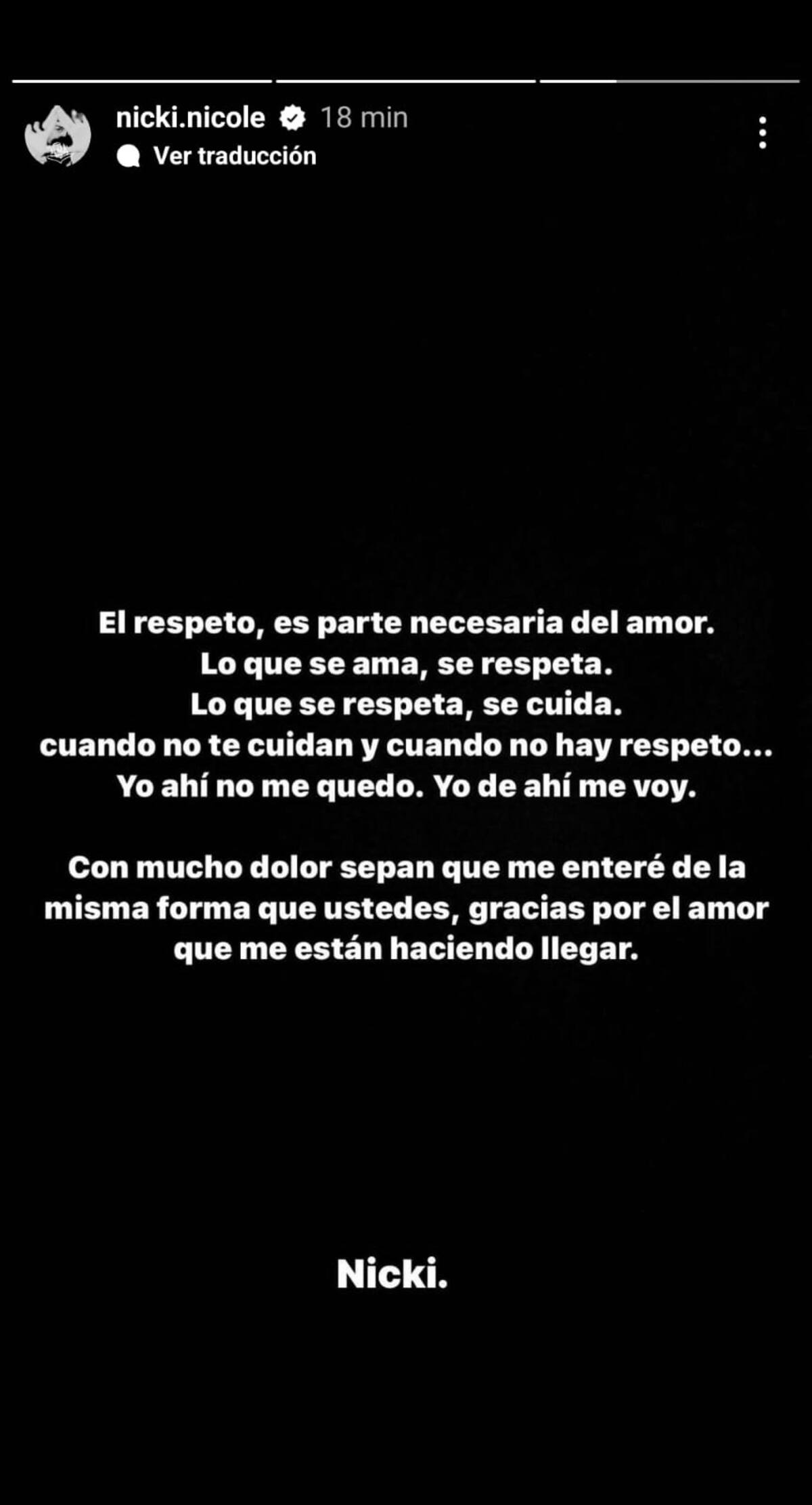 “El respeto, es parte necesaria del amor. Lo que se ama, se respeta. Lo que se respeta, se cuida. Cuando no te cuidan y cuando no hay respeto... Yo ahí no me quedo. Yo de ahí me voy. Con mucho dolor, sepan que me enteré de la misma forma que ustedes. Gracias por el amor que me están haciendo llegar”, fue el comunicado de Nicki.