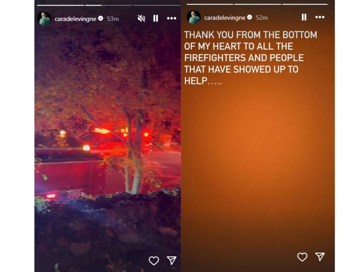 Cara publicó en sus historias de Instagram un video donde se aprecian los camiones de bomberos que atendieron el incendio de su casa y, en otra historia, les dedicó unas palabras de agradecimiento.