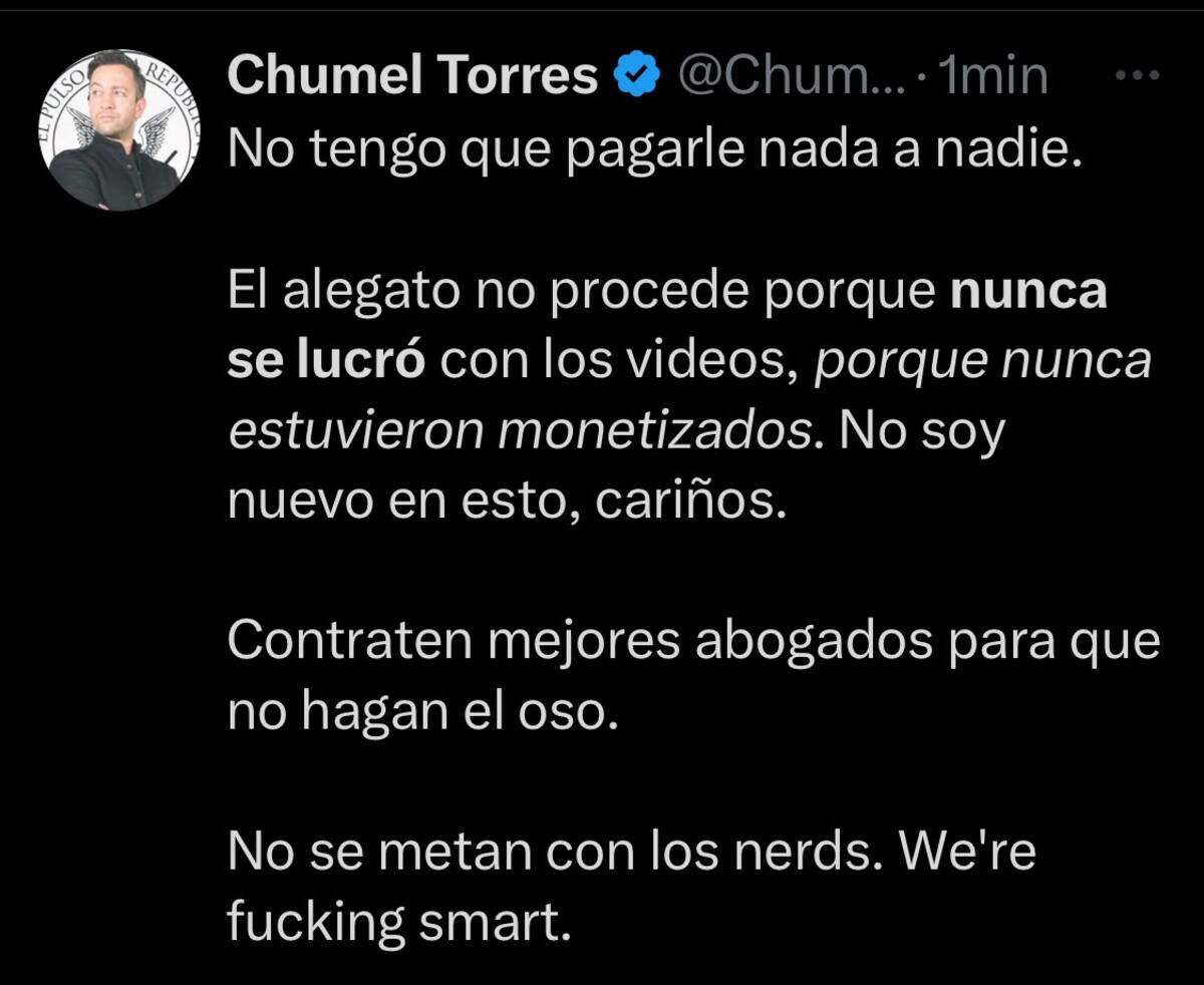 En respuesta, Chumel Torres ha defendido su posición alegando que no monetizó el video en el que usó la canción de Gloria Trevi, argumentando que, por lo tanto, no tiene la obligación de pagar ningún tipo de compensación. Su mensaje, publicado en su cuenta oficial de X, antes Twitter, desató aún más el debate en línea entre quienes apoyan a la cantante y aquellos que respaldan al youtuber.