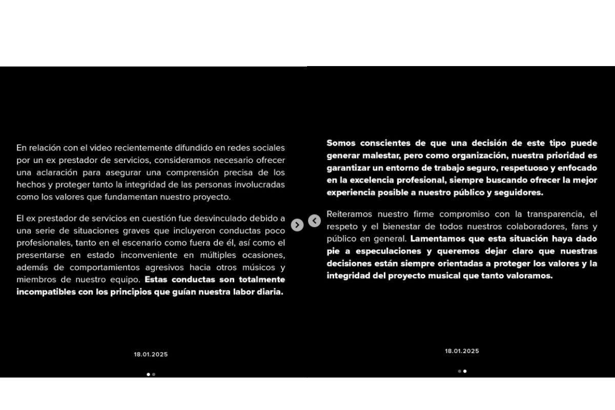 Según el comunicado, el exprestador de servicios fue retirado de su equipo debido a “situaciones graves” que incluyeron conductas poco profesionales dentro y fuera del escenario.Estas conductas también incluyeron presentarse en estado inconveniente en múltiples ocasiones y comportamientos agresivos hacia otros músicos y miembros del equipo. Carín León enfatizó que estas acciones son “totalmente incompatibles con los principios que guían nuestra labor diaria”.