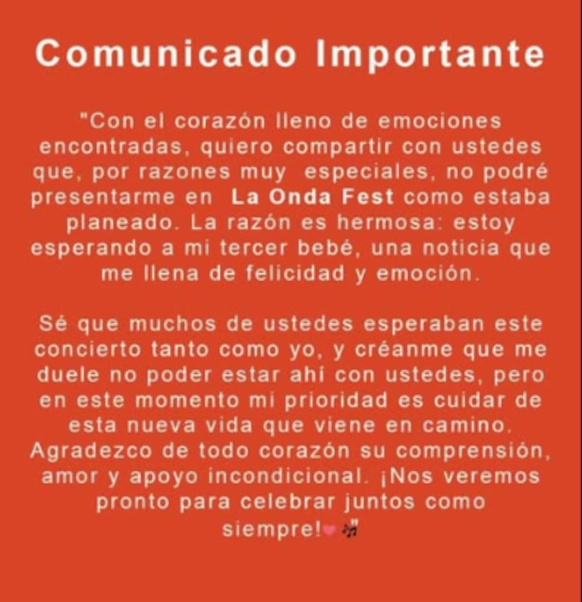 “Con el corazón lleno de emociones encontradas, quiero compartir con ustedes que, por razones muy especiales, no podré presentarme en La Onda Fest como estaba planeado. La razón es hermosa: estoy esperando a mi tercer bebé, una noticia que me llena de felicidad y emoción", escribió Yuridia