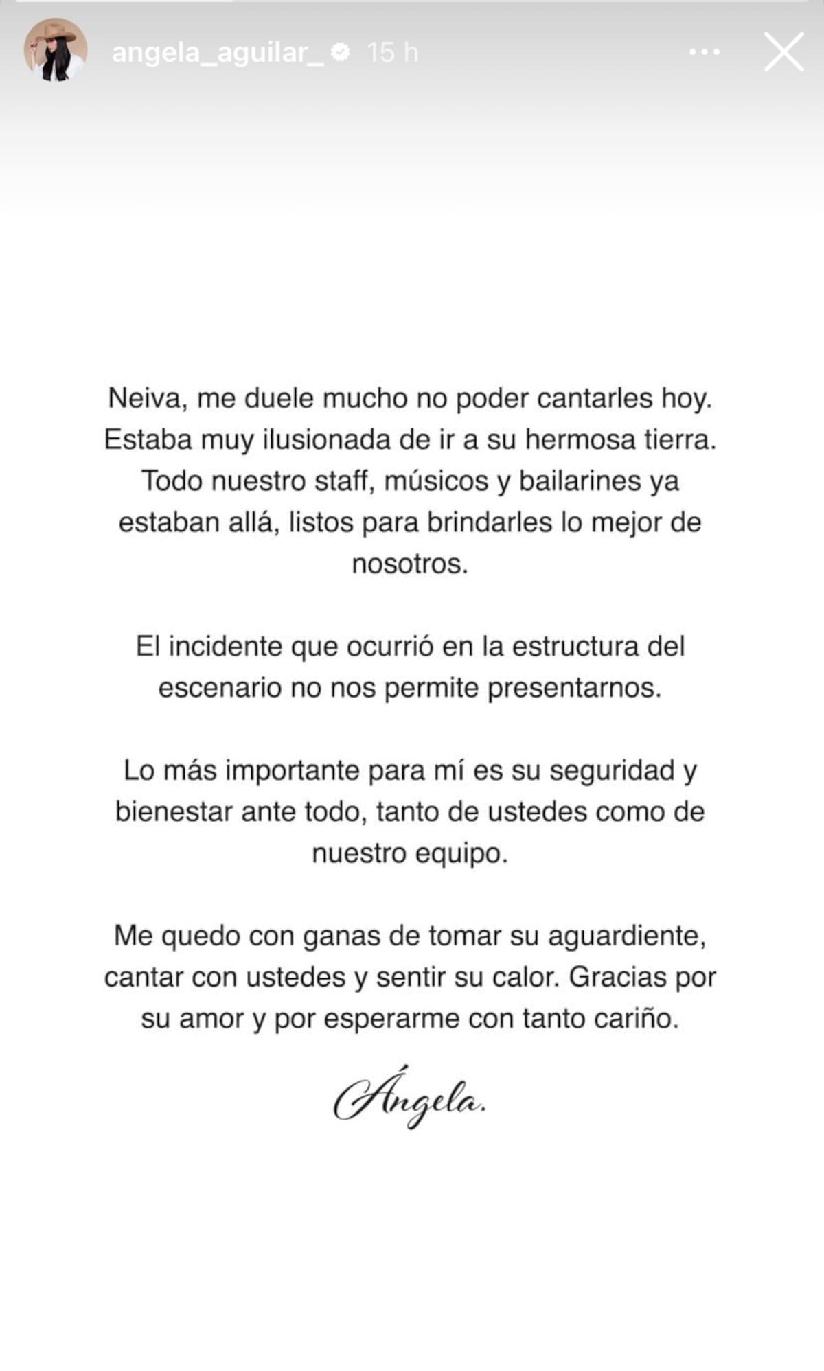 “Neiva, me duele mucho no poder cantarles hoy. Estaba muy ilusionada de ir a su hermosa tierra”, escribió la artista en un mensaje publicado en su cuenta oficial de Instagram.