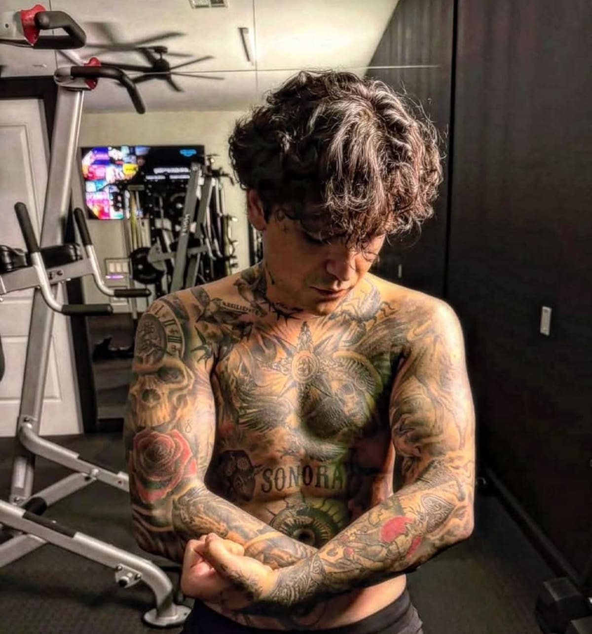 En la imagen, Nodal aparece en un gimnasio mientras hace una pose en la que resalta sus tattoos y su tonificado cuerpo, dejando claro que está más en forma que nunca.