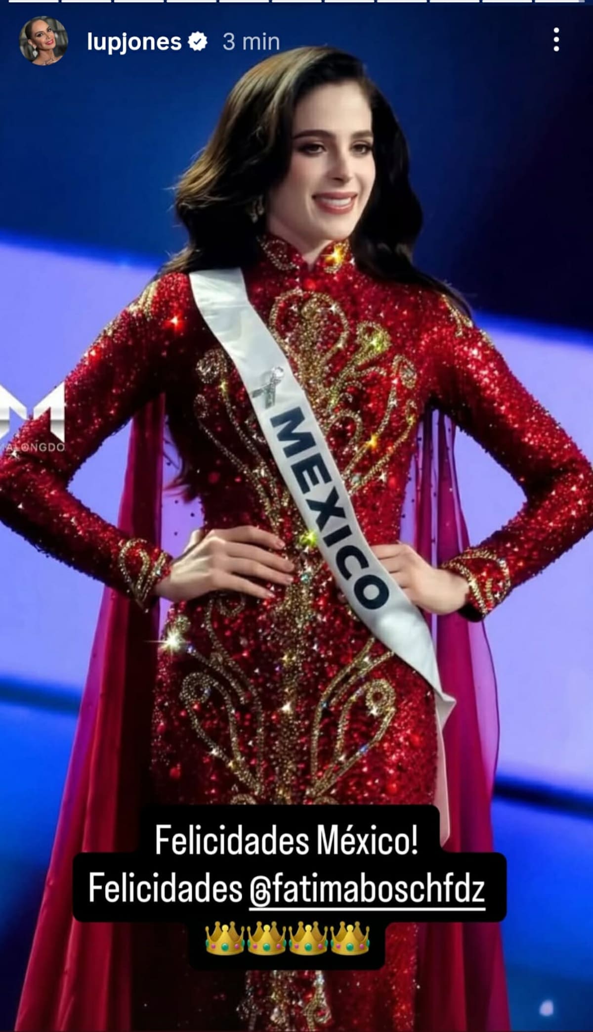 Una de ellas fue Lupita Jones, la primera mexicana en ganar Miss Universo, quien celebró públicamente el triunfo de la tabasqueña. Antes del mensaje de felicitación, Jones había sido una de las voces que más críticas expresó sobre los nuevos lineamientos de la competencia rumbo a la edición 2025.