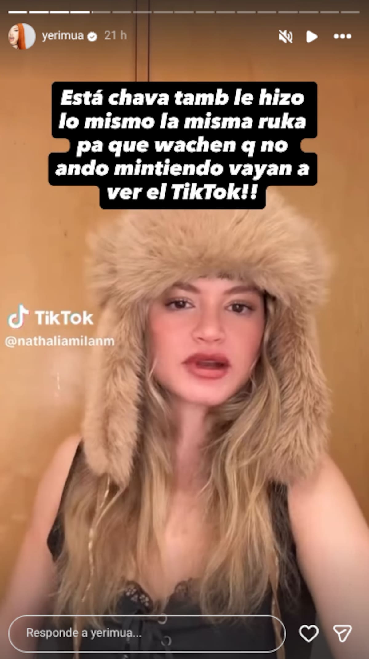 Tras la publicación del video de Nathalia Milan, Yeri Mua no tardó en reaccionar. La influencer reposteó el contenido en sus redes sociales con el mensaje:“A esta chava también le hizo lo mismo la misma ruca. Para que wachen que no ando mintiendo. Vayan a ver el TikTok”.