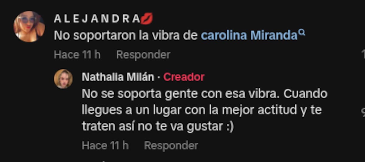 La conversación en torno al video de Nathalia Milan no se quedó solo en su testimonio inicial. En la sección de comentarios, una usuaria escribió que tanto Nathalia como Yeri Mua “no soportaron la vibra de Carolina Miranda”, insinuando que la incomodidad había sido una percepción exagerada o personal.