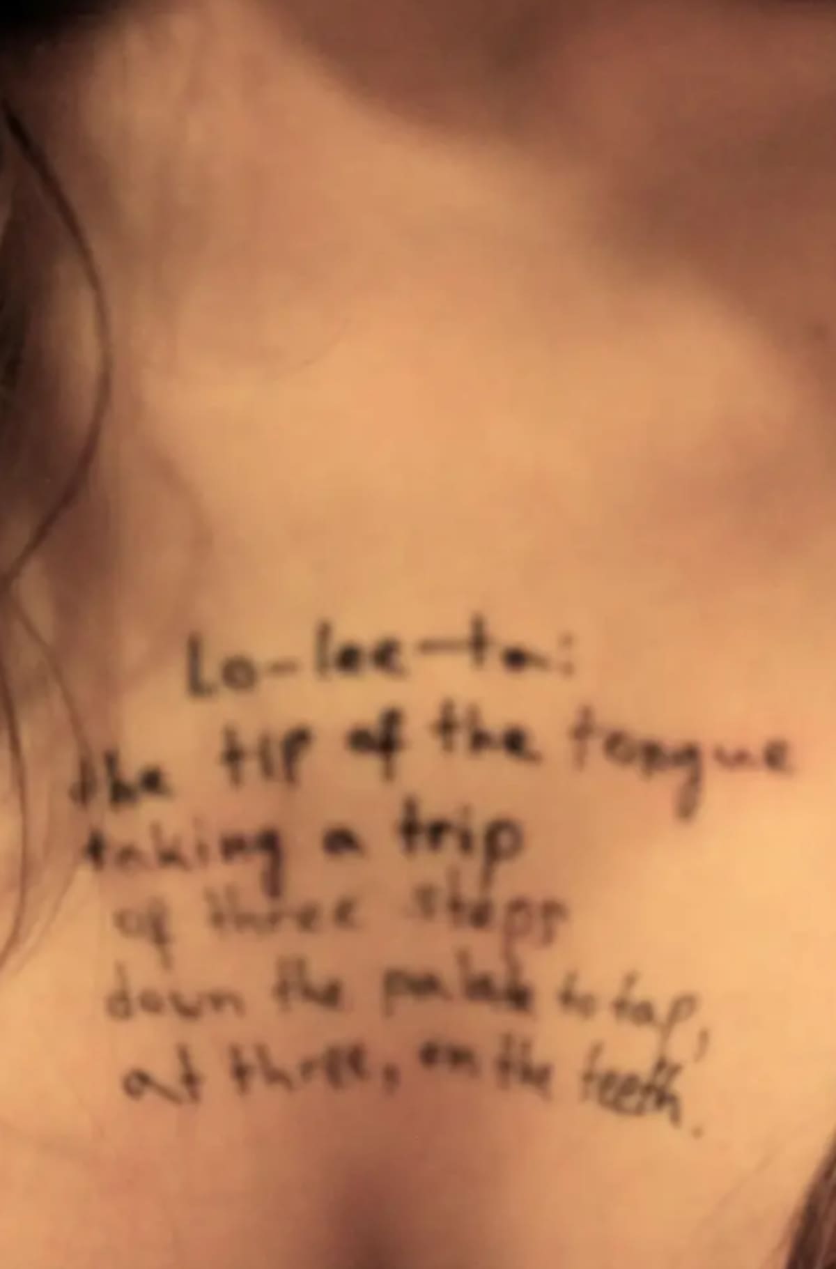 - Imágenes que muestran a cuerpos rayados con frases que hacen referencia directa a la novela Lolita, de Vladimir Nabokov.