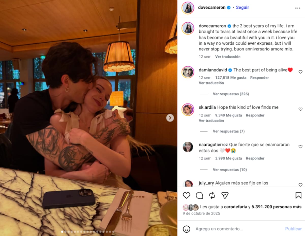 Dove Cameron y Damiano David anunciaron su compromiso tras dos años de relación con un emotivo mensaje en Instagram y varias apariciones públicas juntos.