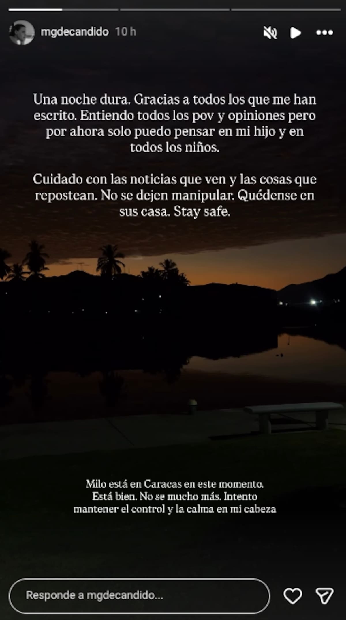 “Milo está en Caracas en este momento. Está bien. No sé mucho más. Intento mantener el control y la calma en mi cabeza”.