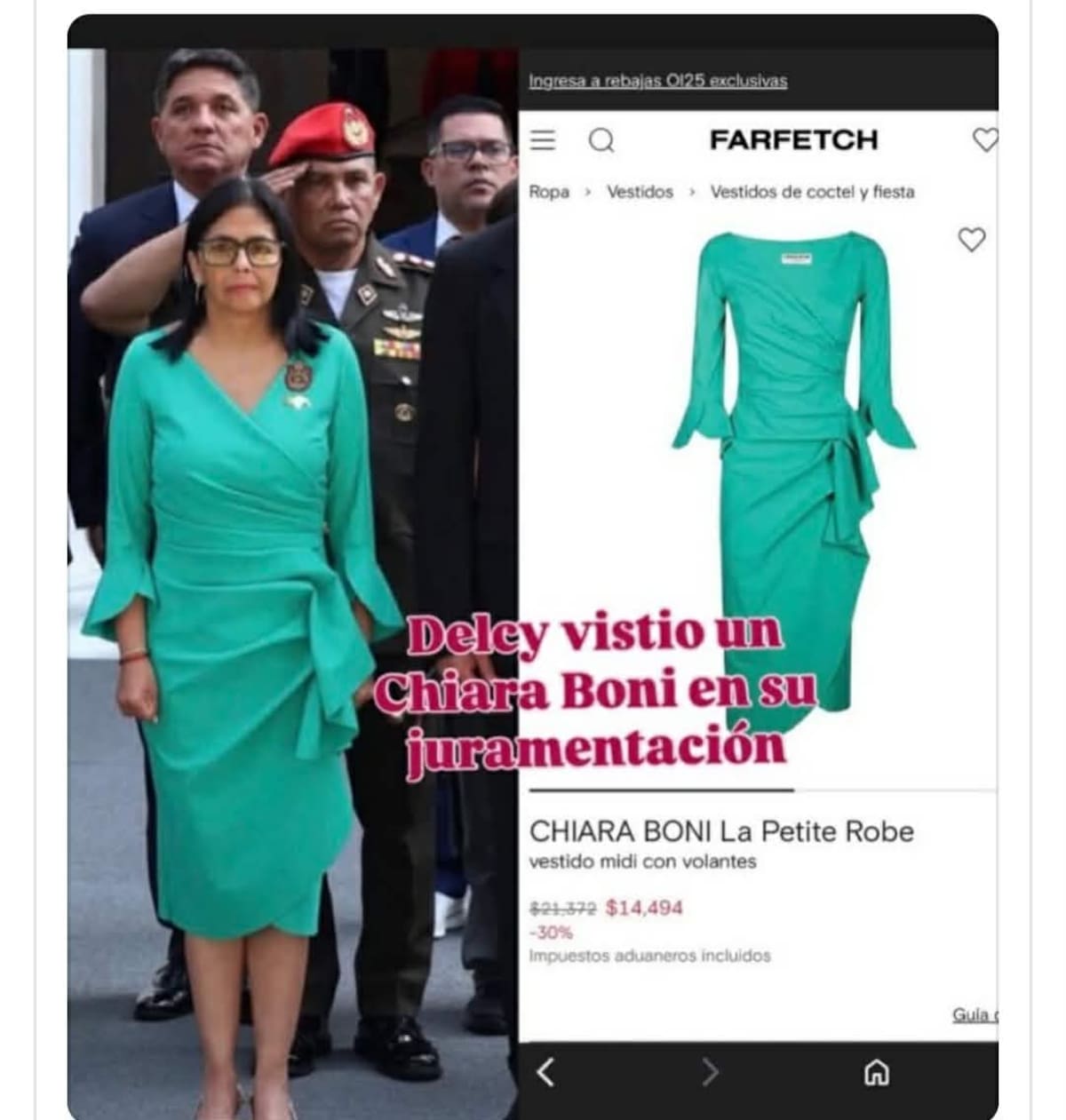 El atuendo de Delcy Rodríguez fue identificado como un diseño de la marca italiana Chiara Boni, específicamente de la línea La Petite Robe, conocida por sus vestidos de fiesta y cóctel de alta gama.