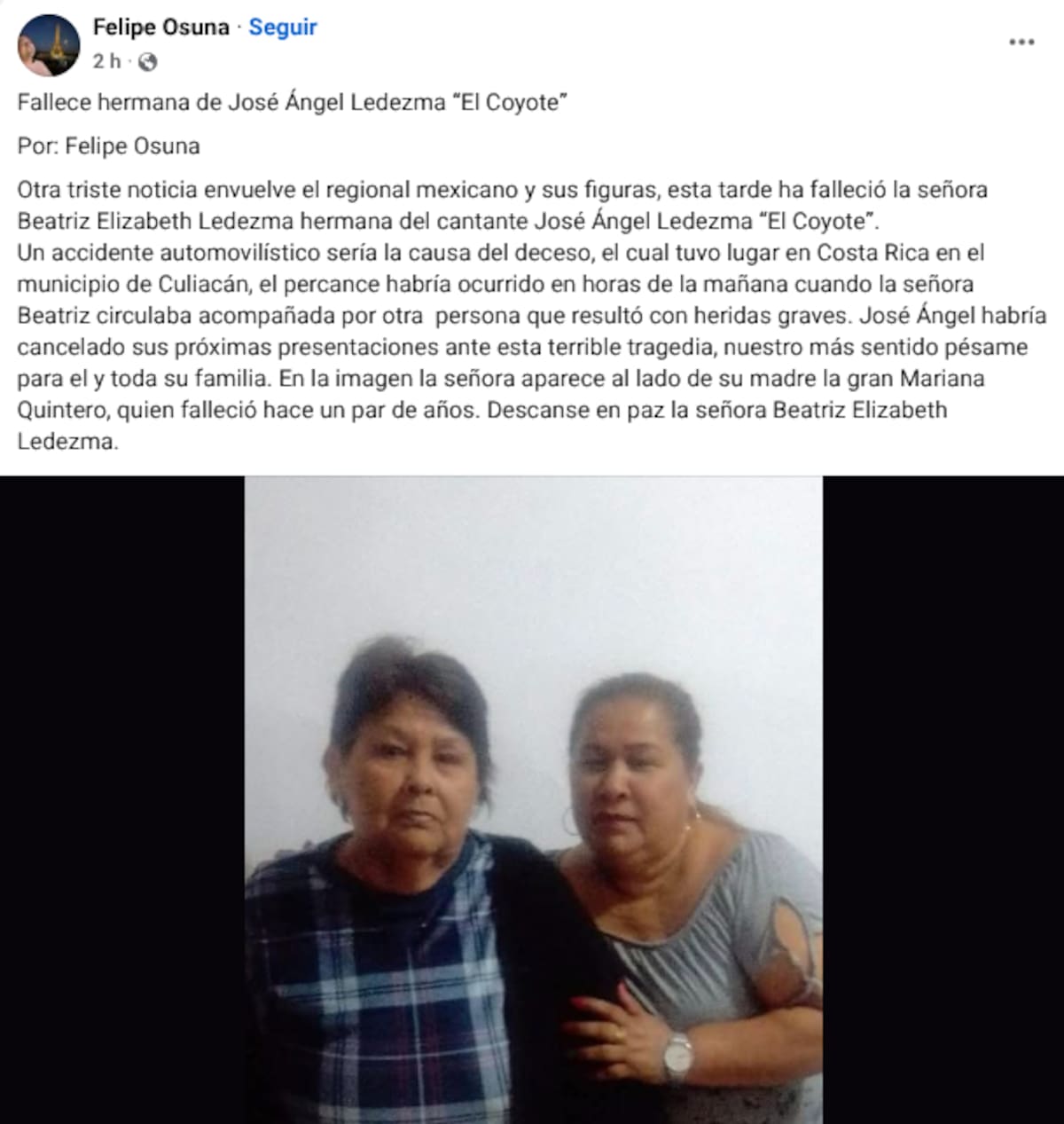 “Otra triste noticia envuelve el regional mexicano y sus figuras, esta tarde ha fallecido la señora Beatriz Elizabeth Ledezma, hermana del cantante José Ángel Ledezma ‘El Coyote’”.