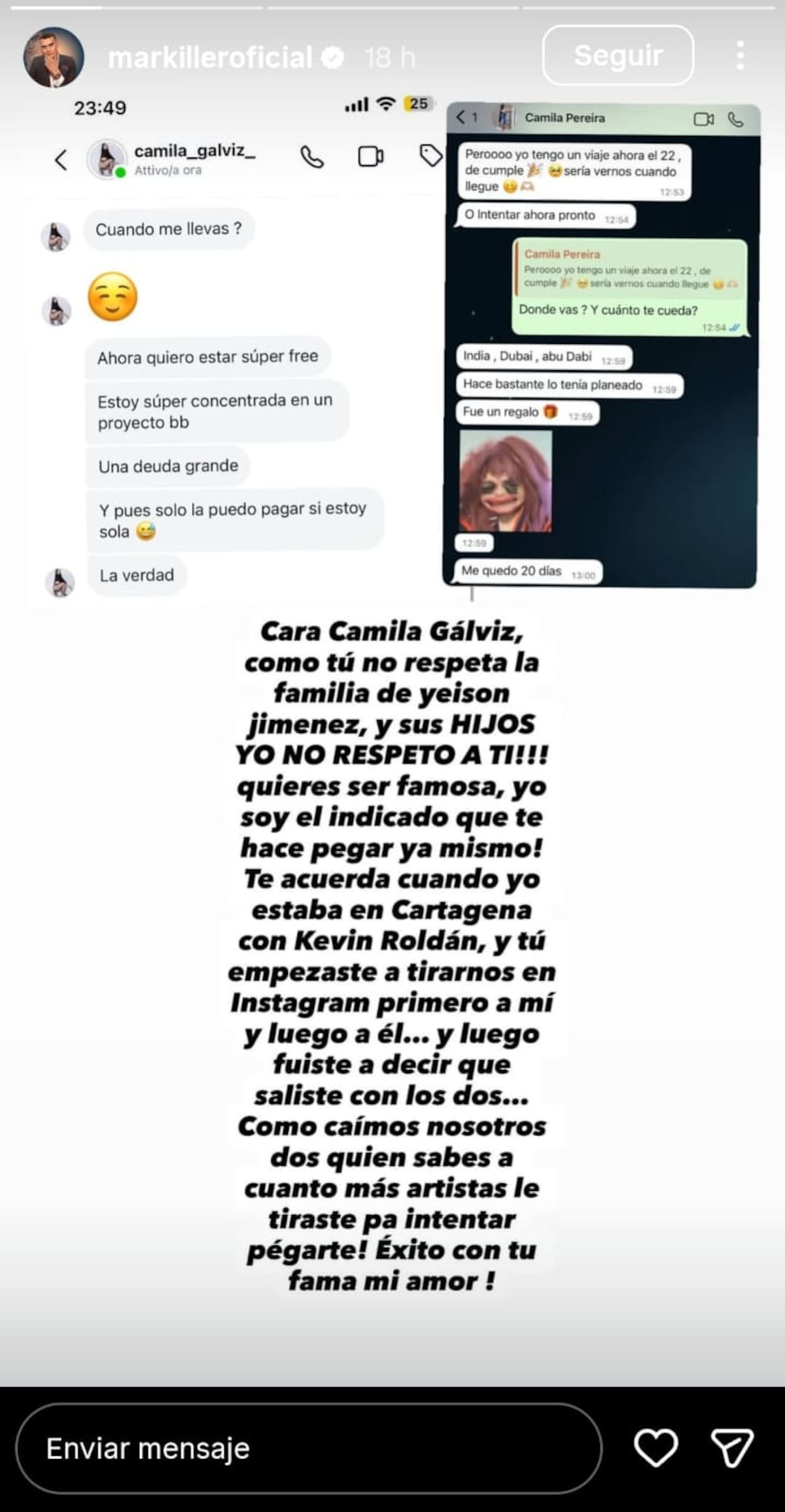 Frente a las afirmaciones de Markiller, Camila Galviz negó categóricamente cualquier vínculo sentimental con Yeison Jiménez o con el propio cantante urbano. En su defensa, la modelo explicó que no conocía ni había hablado con Markiller y que muchas de las publicaciones y rumores que circulan son producto de malentendidos o de personas que buscan generar “escándalo”.
