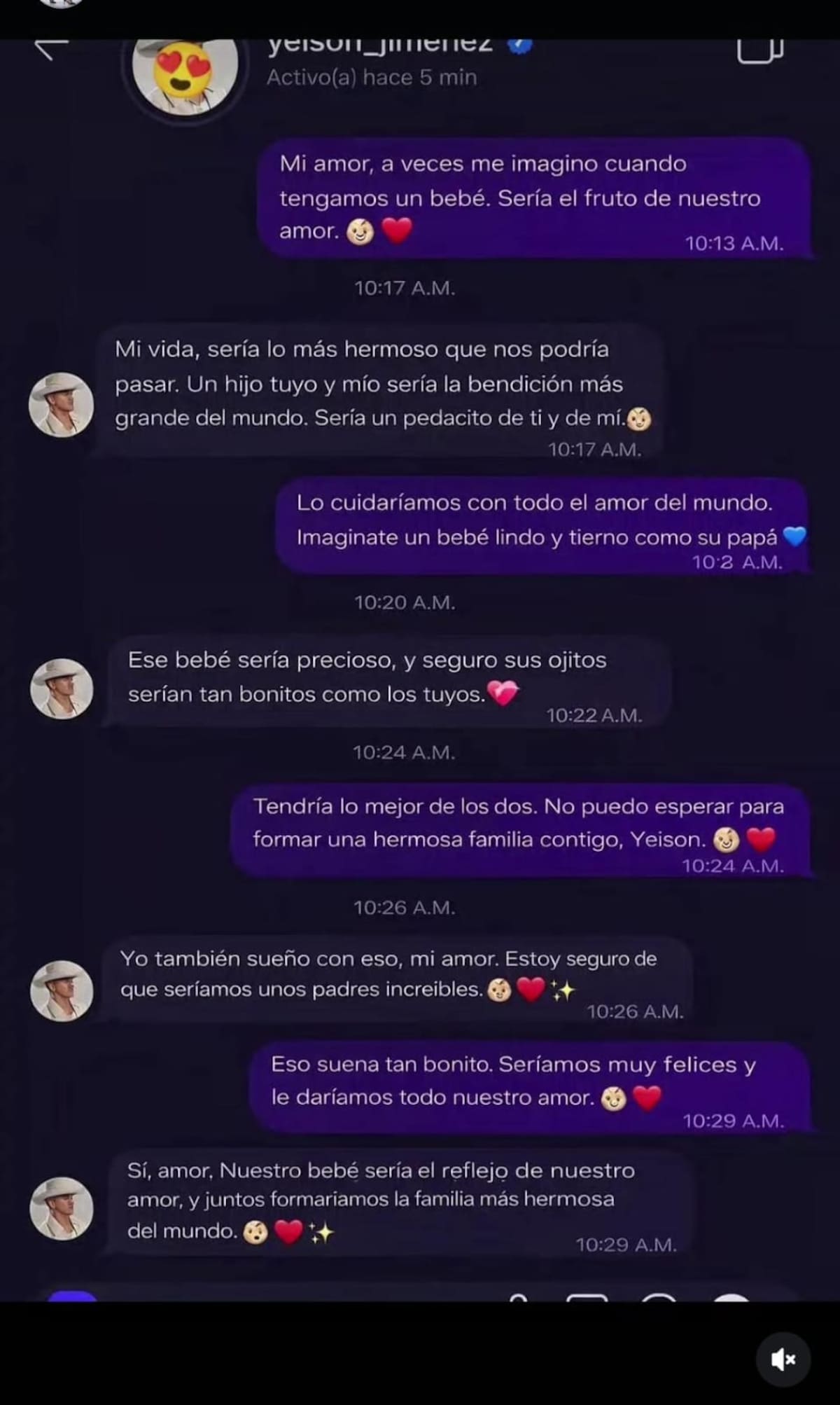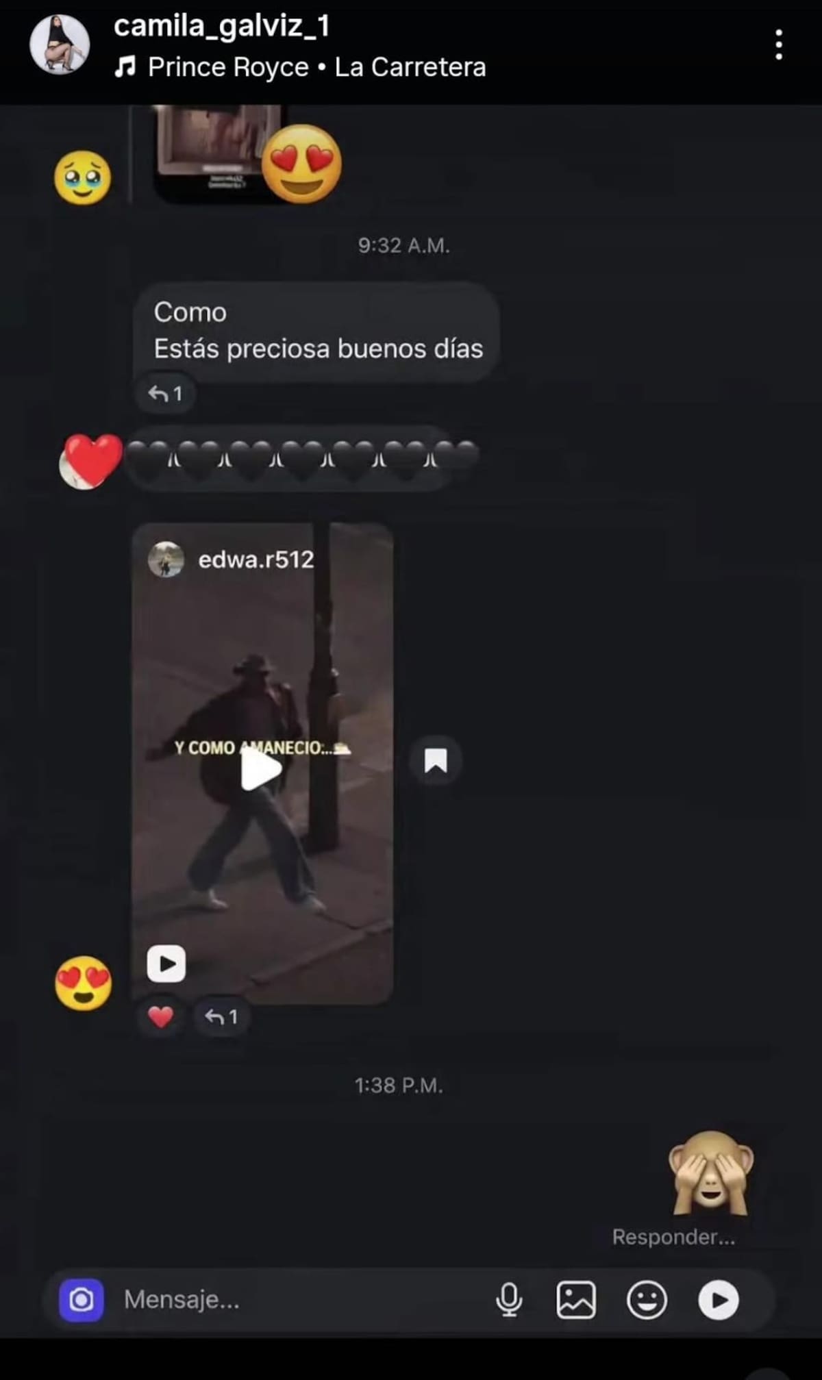 Los rumores comenzaron cuando Galviz publicó en su cuenta de Instagram una selfie con Jiménez junto al mensaje “No lo creo” acompañado de corazones rotos, además de capturas de lo que ella afirmó fueron mensajes privados del artista saludándola cordialmente. En uno de esos mensajes, supuestamente, el cantante le escribió: “Cómo estás preciosa, buenos días”.