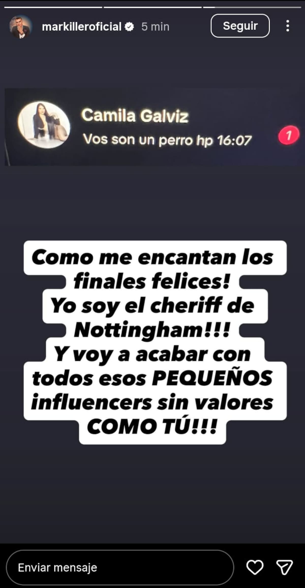Por su parte, Markillero reafirmó su versión publicando una historia donde se le ve a Camila reclamarle por la exposición mediática, diciendo: “Cómo me gustan los finales felices”.