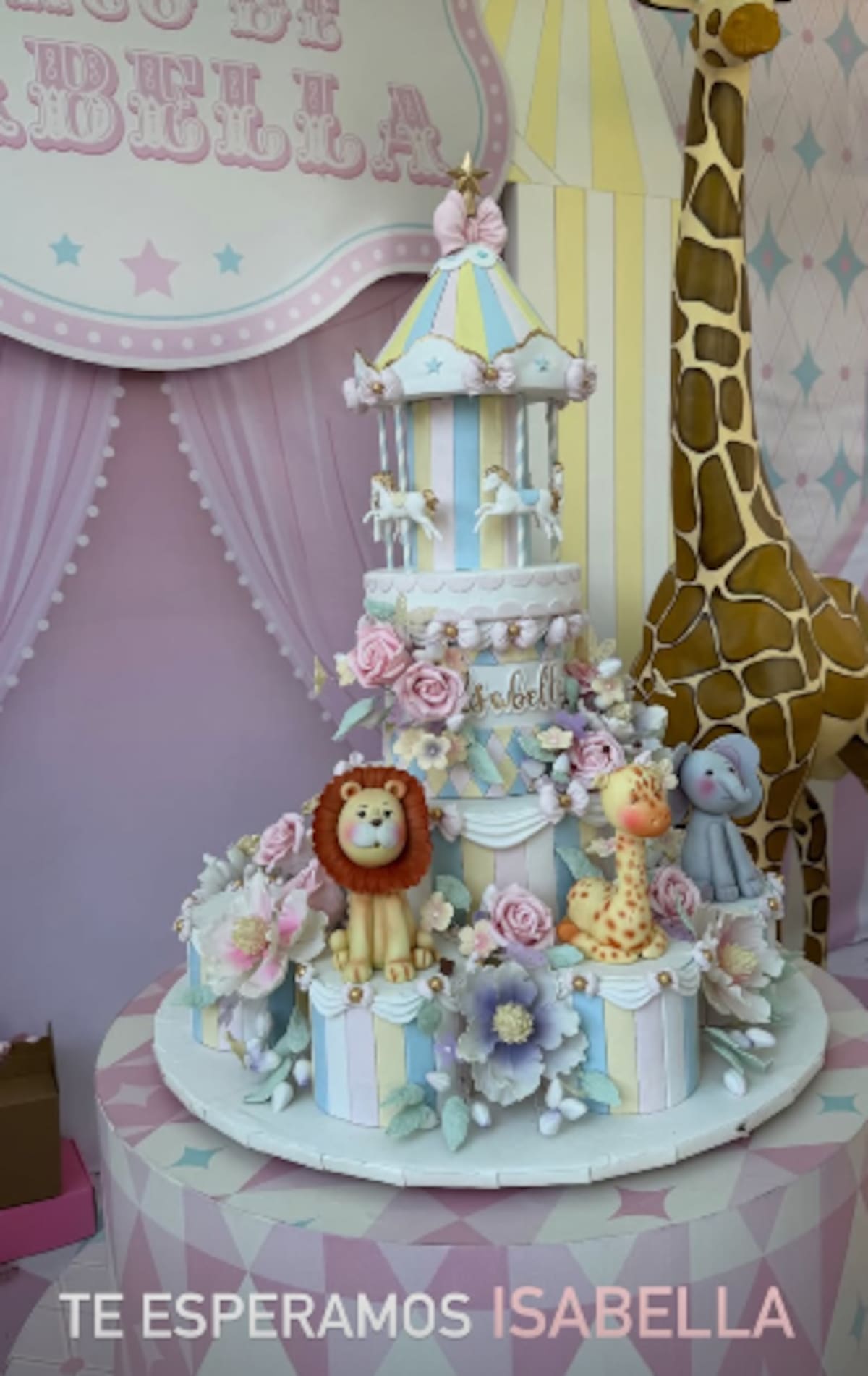 Los detalles compartidos en redes sociales muestran una decoración elegante en tonos pastel y una temática circense que fue parte del diseño del festejo.