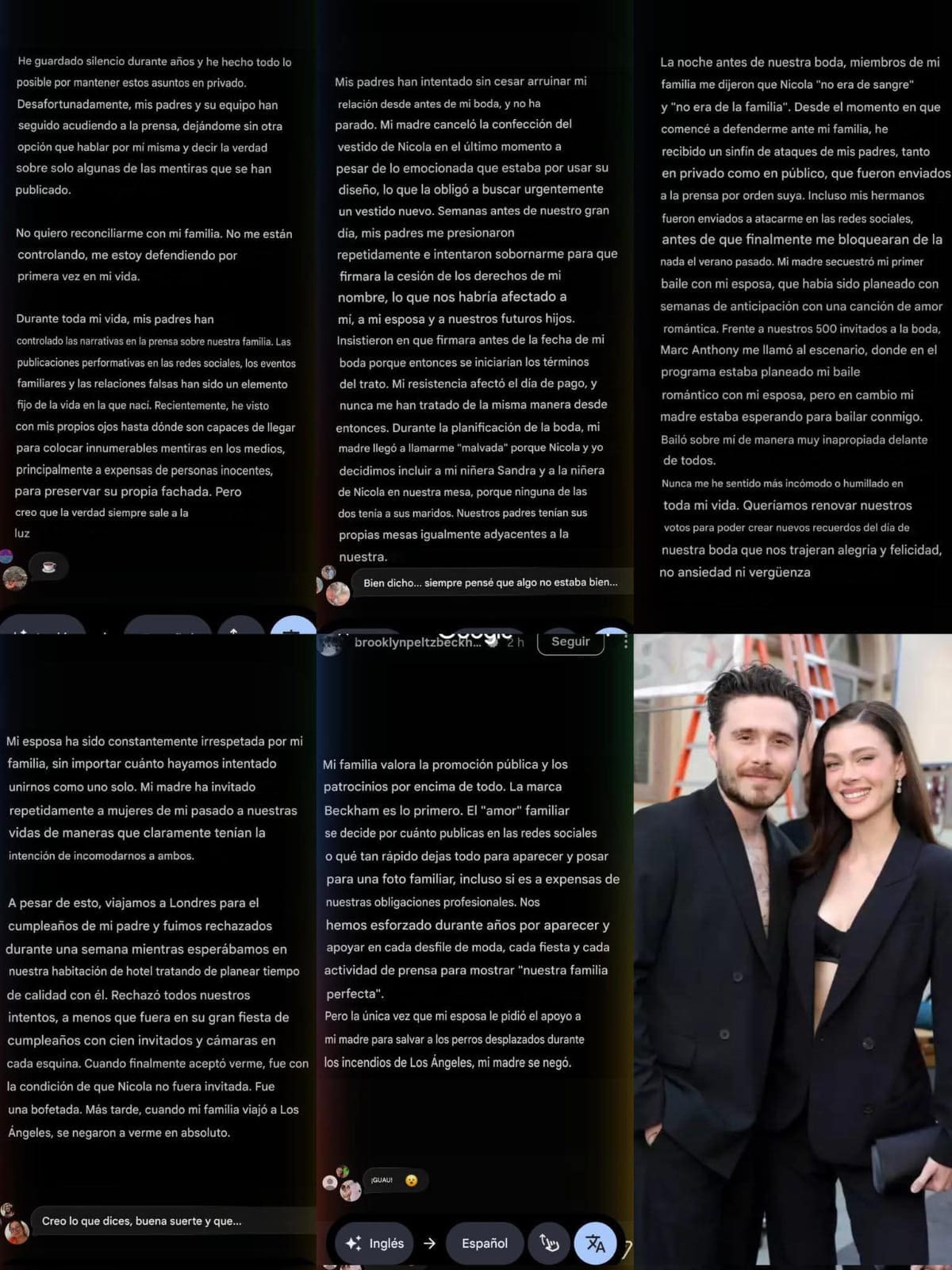 Brooklyn afirmó que su madre estaba esperando para bailar con él y que lo hizo de forma que consideró “muy inapropiada” frente a los invitados, lo que lo hizo sentirse humillado. Fuentes citadas por People señalaron que el ambiente quedó en silencio y que Nicola salió del salón llorando.