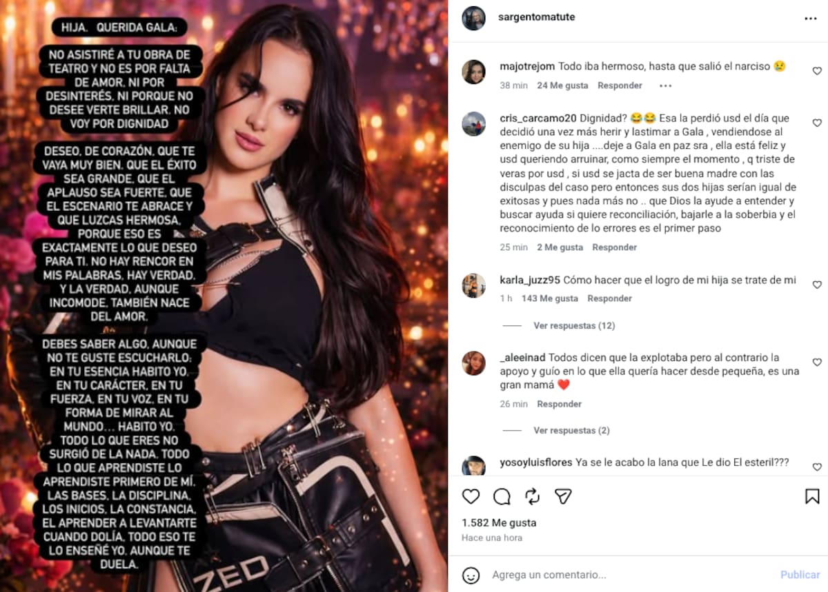 A través de una publicación en sus redes sociales, Crista Montes publicó un mensaje dirigido directamente a su hija Gala, en el que explica de manera explayada por qué no asistirá a verla interpretar en Malinche. El texto fue compartido ampliamente y contiene frases que abren una ventana al conflicto entre ambas. El mensaje dice:
