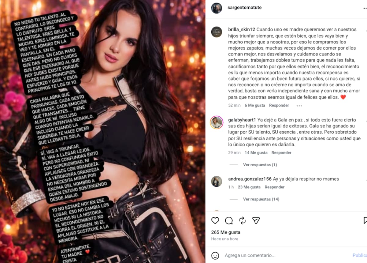 En su texto, Crista Montes asegura que su ausencia no responde a falta de amor o interés por la carrera de su hija, sino a lo que ella describe como “dignidad”, resaltando que su enseñanza y apoyo inicial fundamentaron parte del éxito de Gala. En uno de los fragmentos del mensaje, la madre señala:
