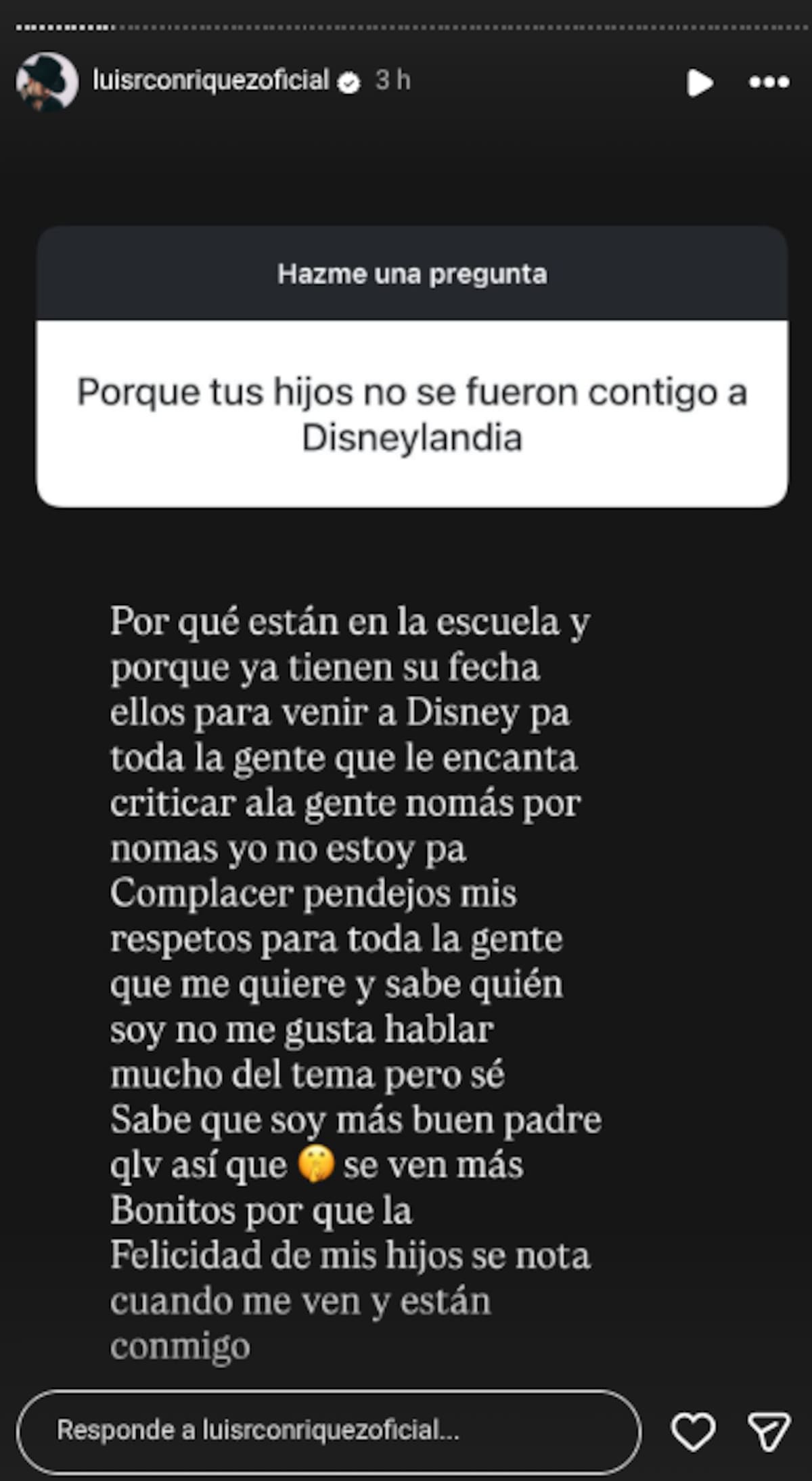 Ante esto, Luis R. Conriquez respondió con un mensaje extenso y contundente, dejando clara su postura frente a quienes lo critican por su vida personal y su rol como padre. El cantante escribió: