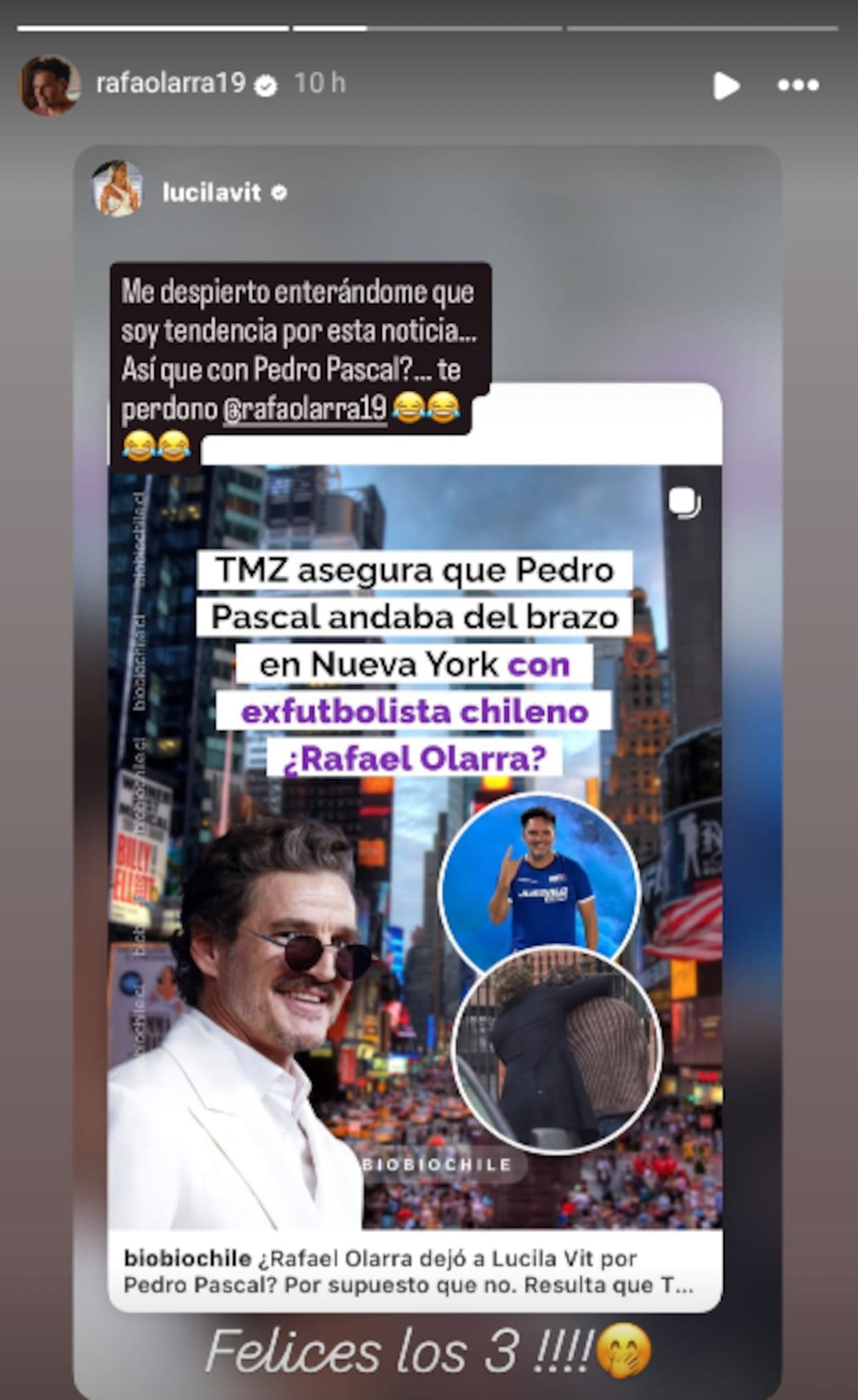 Por su parte, Lucila Vit también reaccionó a la tendencia con una publicación en Instagram donde escribió en tono jocoso: “Me despierto enterándome que soy tendencia por esta noticia... ¿Así que con Pedro Pascal? Te perdono @rafaolarra19”.