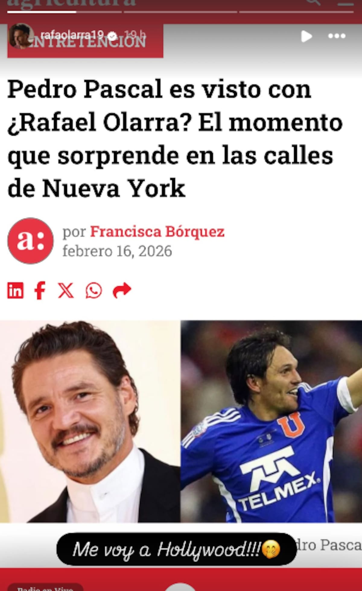 La confusión escaló cuando el verdadero exfutbolista Rafael Olarra —quien actualmente mantiene una relación con la modelo Lucila Vit— se tomó con humor la situación en sus redes sociales y compartió la noticia junto al comentario: “Me voy a Hollywood!!!”.