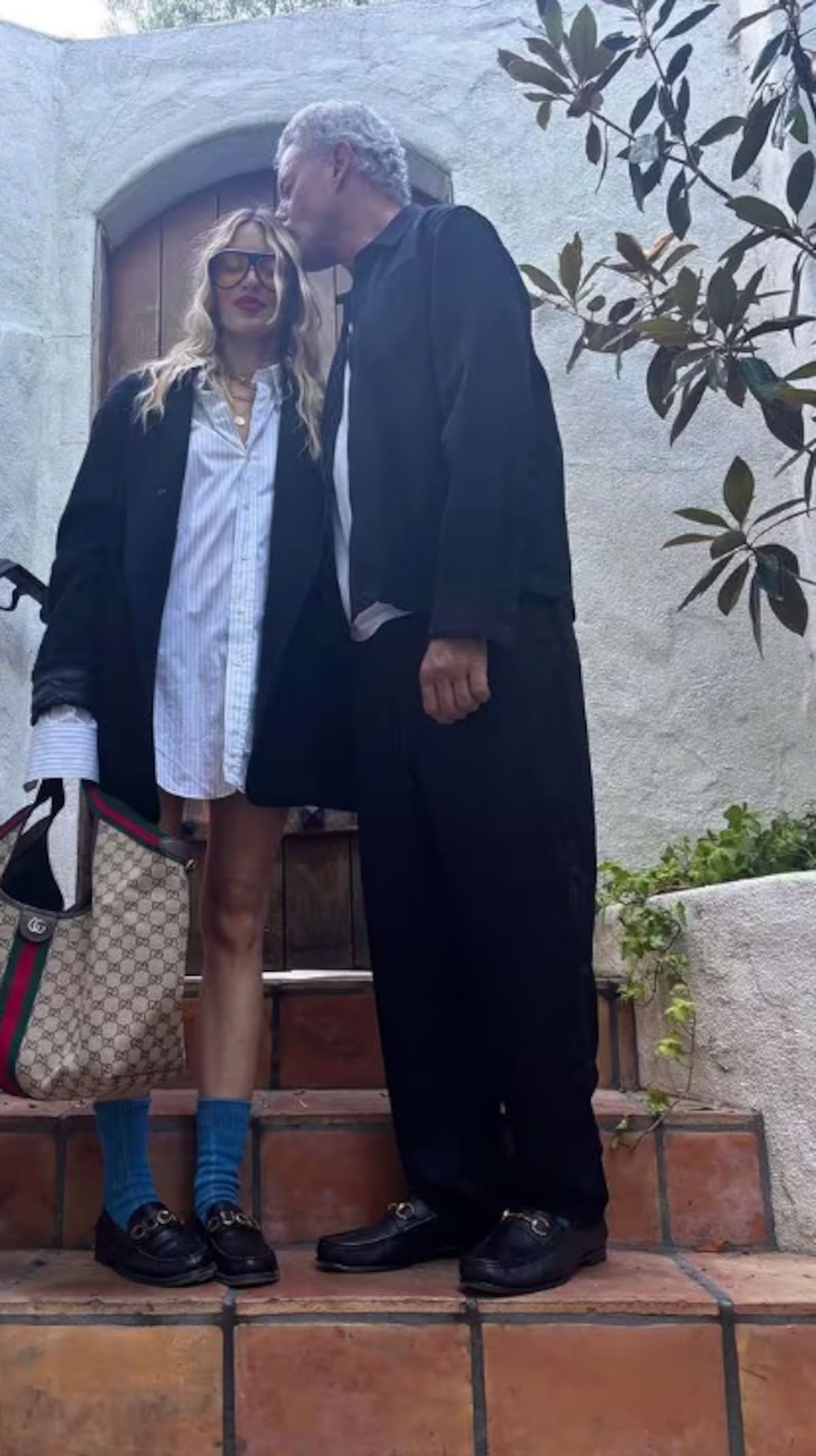 - Una imagen en la que él le da un beso en la cabeza mientras posan juntos frente a unas escaleras.