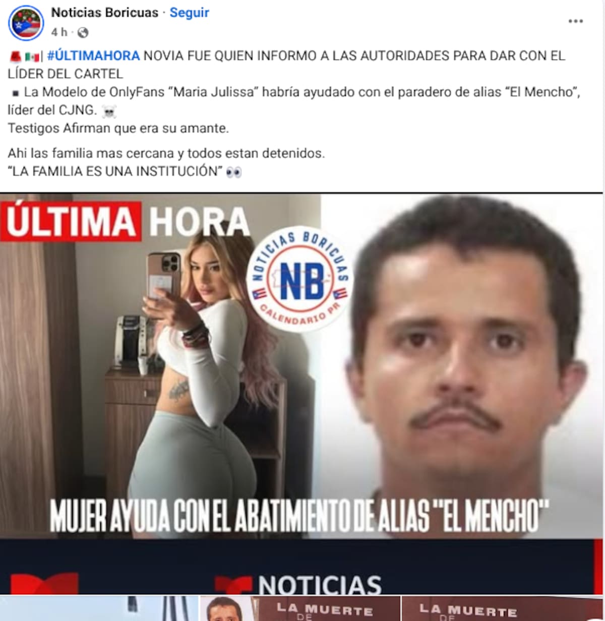 Las publicaciones que circularon en redes sociales afirmaban que el gobierno mexicano habría confirmado que la detención de “El Mencho” ocurrió tras el seguimiento a “Maria Julissa”, a quien señalaban como “señorita de compañía” y presuntamente involucrada en lavado de dinero.