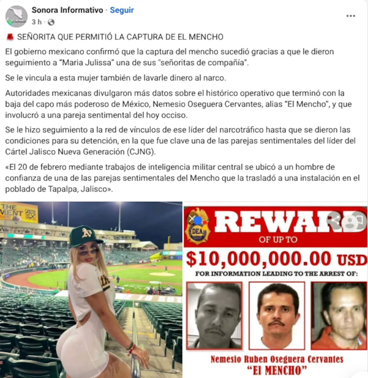 Recientemente, el nombre de María Julissa volvió a ocupar titulares tras la difusión de publicaciones en Facebook que la señalaban como pieza clave en un supuesto operativo relacionado con “El Mencho”. En dichas publicaciones se afirmaba que autoridades mexicanas habrían seguido a una de las parejas sentimentales del líder criminal y que se trataba de la influencer sonorense.