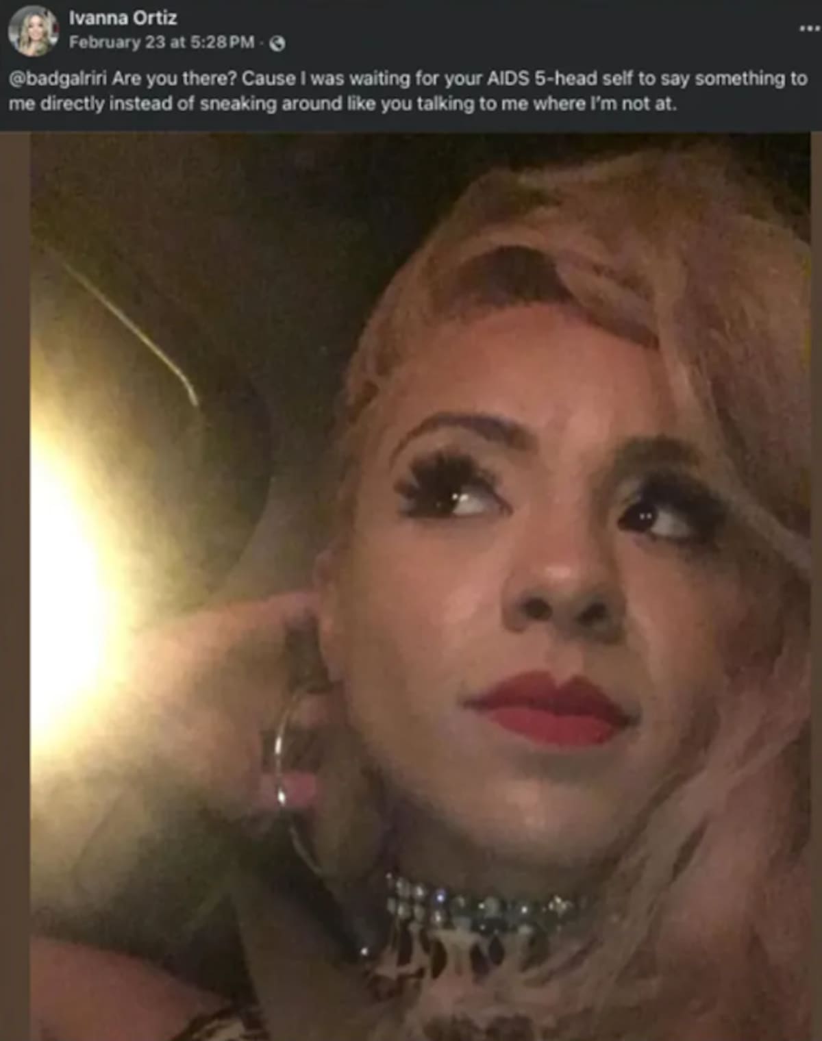 “@badgalriri Are you there? Cause I was waiting for your AIDS 5-head self to say something to me directly instead of sneaking around like you talking to me where I’m not at”.
