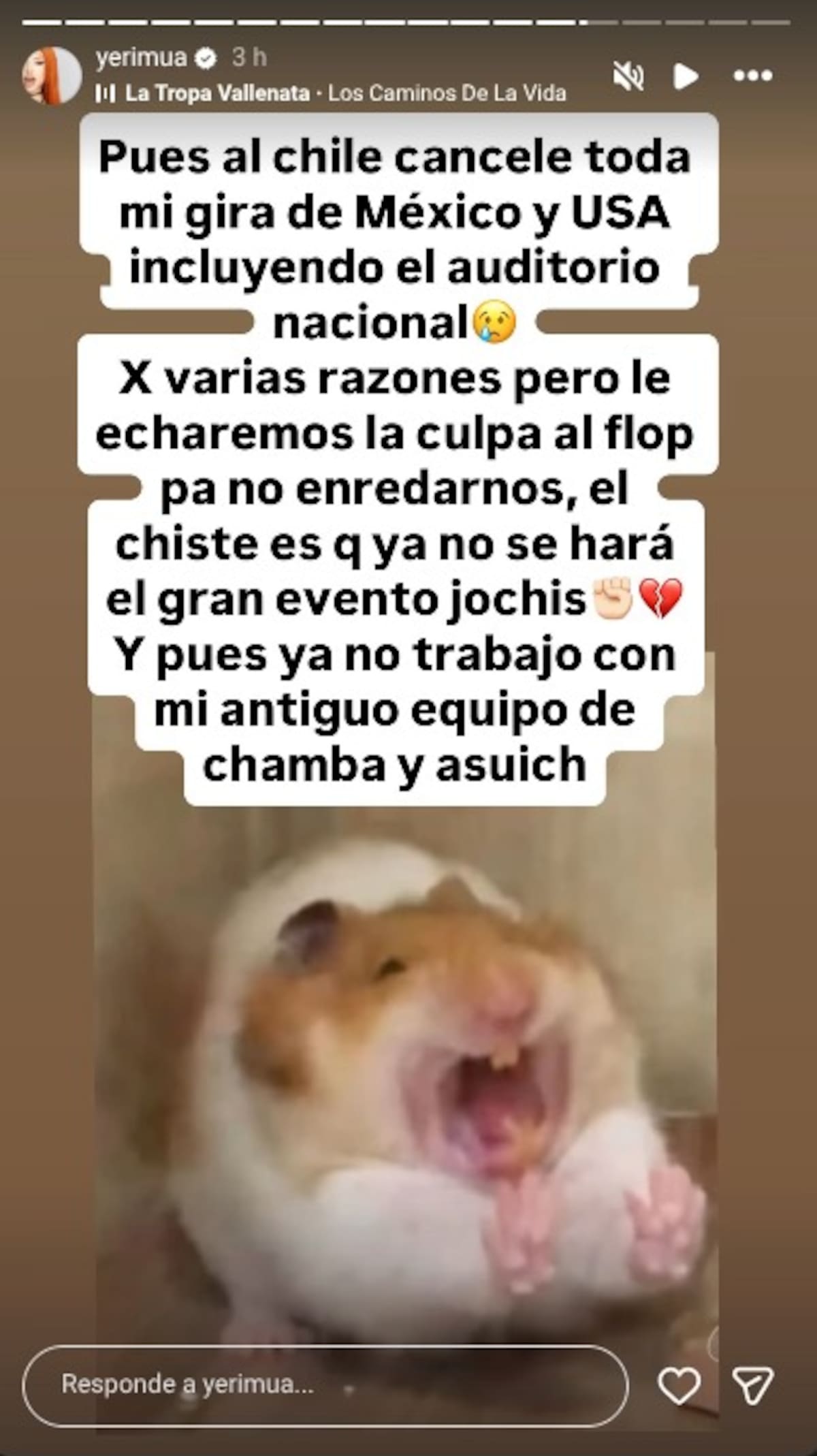 “Pues al chile cancelé toda mi gira de México y USA incluyendo el Auditorio Nacional por varias razones, el chiste es que ya no se hará el gran evento.”