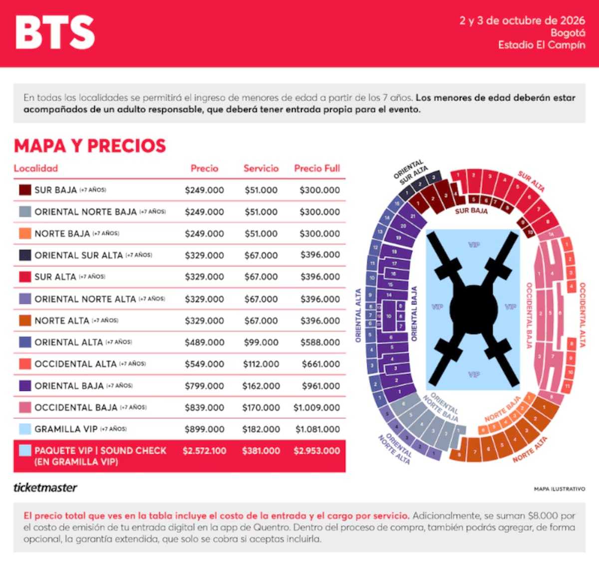 De acuerdo con Infobae, la preventa oficial inició el 7 de abril de 2026, dirigida a miembros del club ARMY, mientras que la venta general comenzó el 10 de abril.
