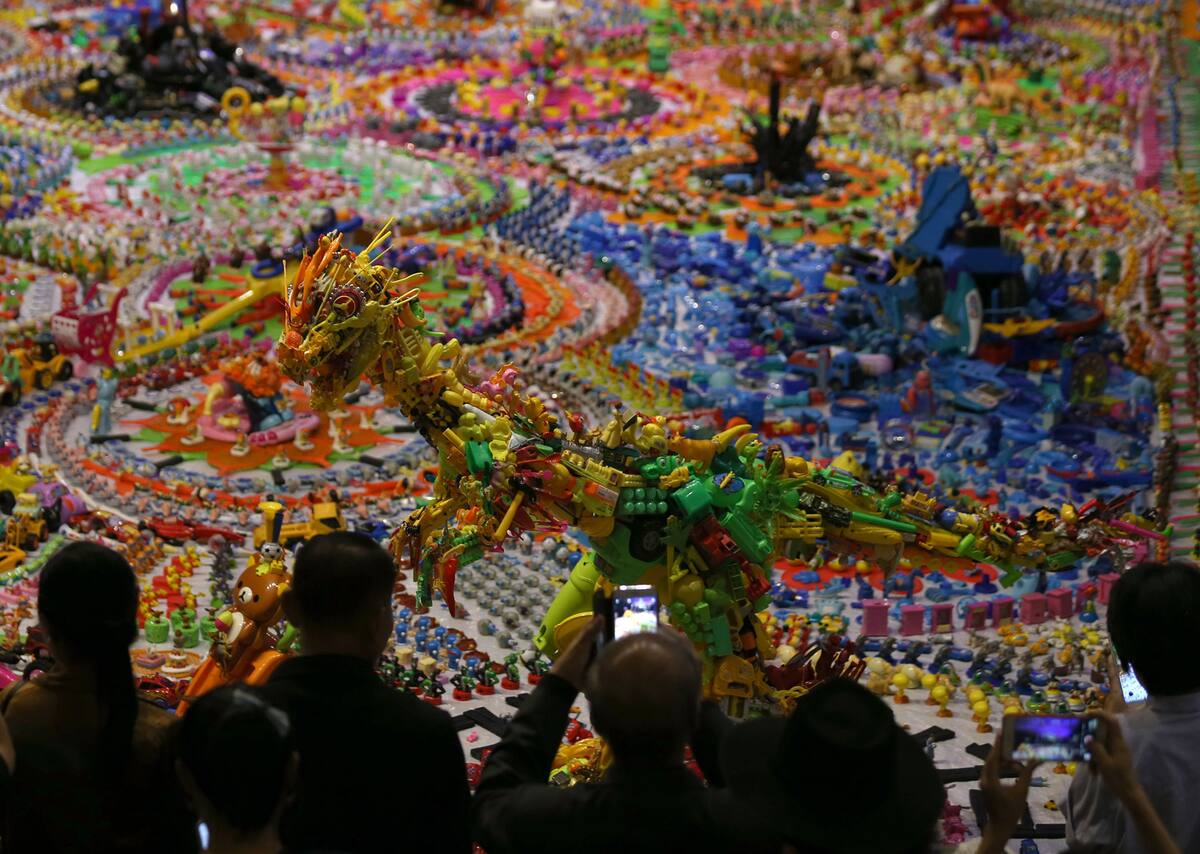 Siguió acumulando juguetes de plástico desechados y, aunque no lleva una cuenta precisa, calcula que puede tener alrededor de 100 mil piezas en su colección con las que realiza obras de arte.