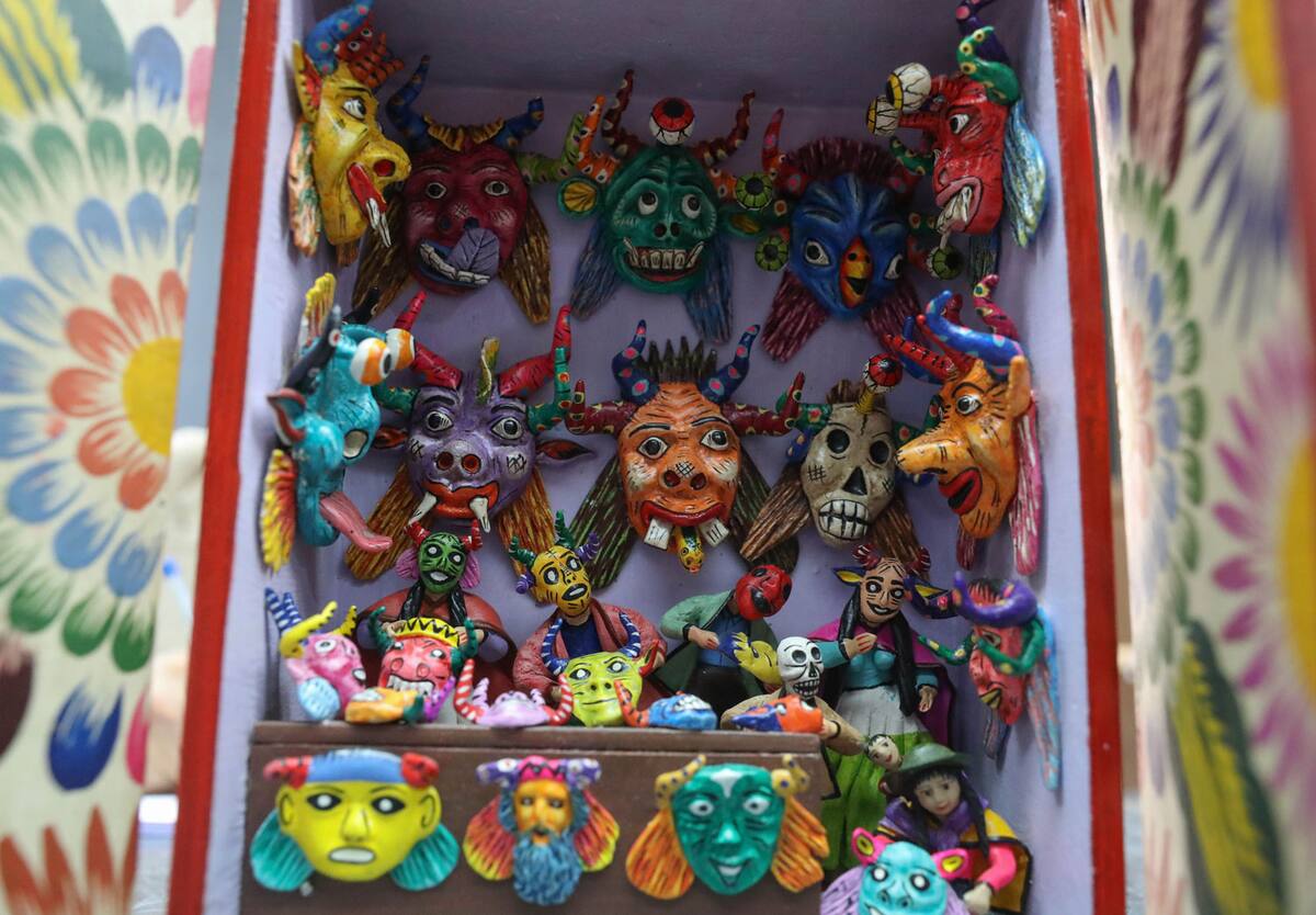 La fabricación de sombreros típicos ayacuchanos o de instrumentos musicales, la fiesta y las máscaras que se usan en los carnavales en esa zona peruana, o el tradicional tejido de mantas son representados en retablos de distintos tamaños y de uno a tres niveles que fueron parte de una muestra en La Paz.