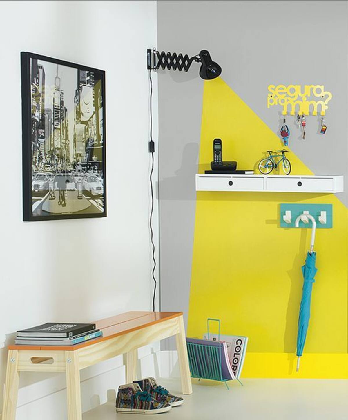 Una de las mejores tendencias es pintar una parte de la pared como si fuera alumbrado por una lámpara. Se trata de poner un tono amarillo o arriesgarte a algo mucho más divertido simulando la luz de un foco; incluso se puede colocar una lámpara falsa o real encima y el efecto será más divertido. Los detalles de decoración deben ir en tonos contrastantes.