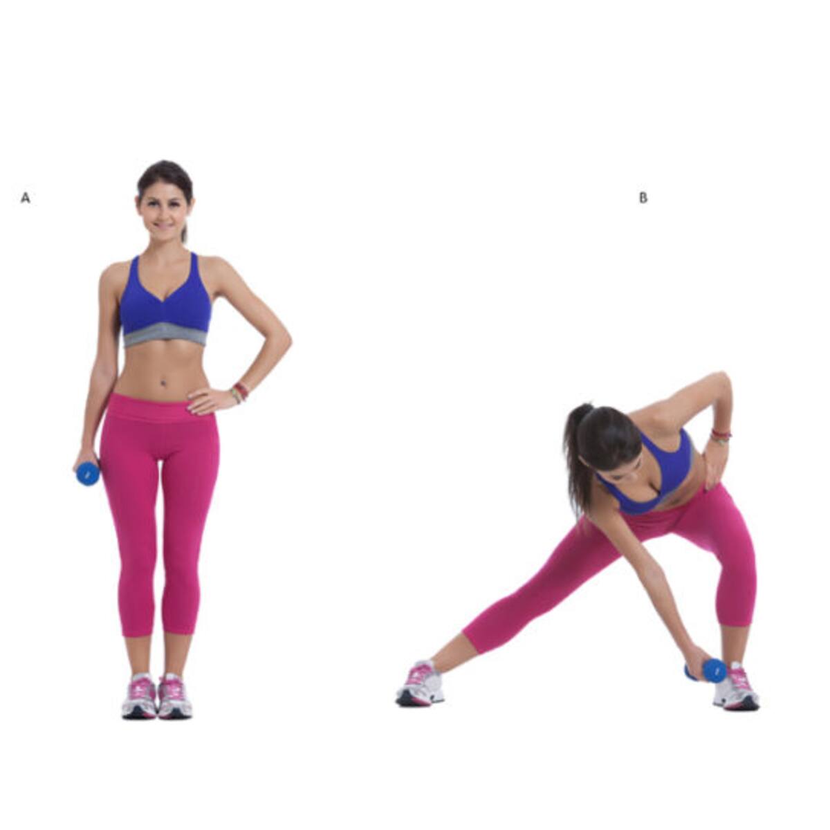 Desde la posición de pie, flexiona ligeramente las rodillas y desplaza tu cuerpo hacia un lado extendiendo la pierna contraria.