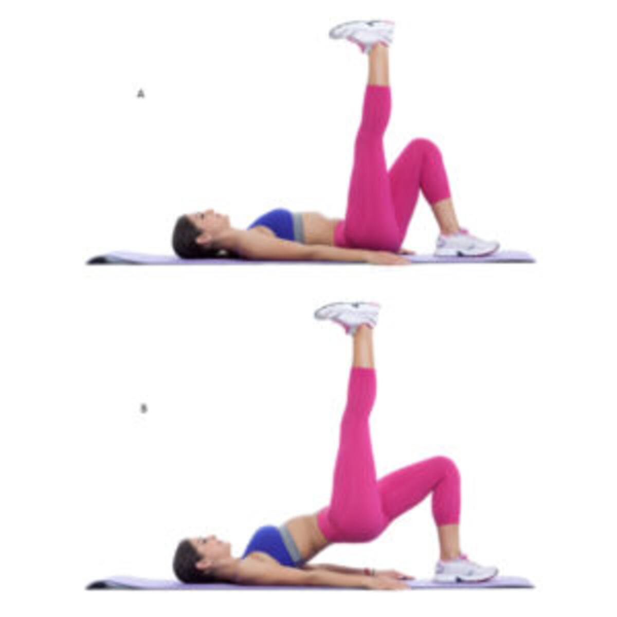 Después eleva las caderas hasta que queden bien alineadas con el torso, como si formaras una línea recta. Baja la cadera y repite con la otra pierna.