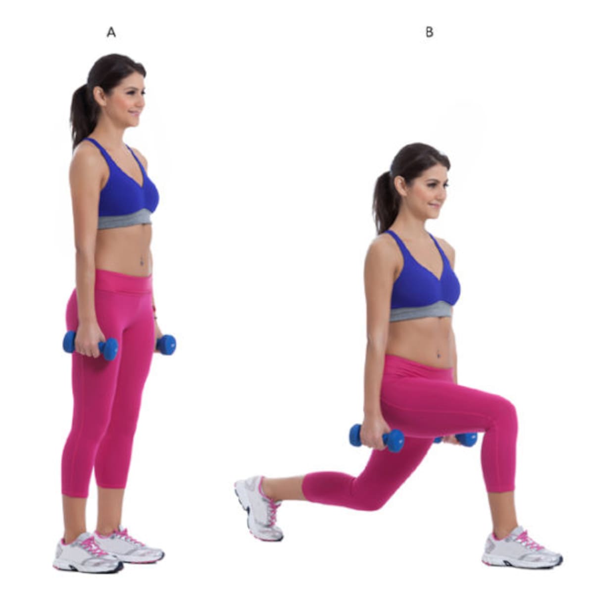 Desde la posición de pie y con una mancuerna, o una botella con agua, en cada mano, da una zancada al frente hacia la posición de desplante, manteniendo un ángulo de 90 grados.