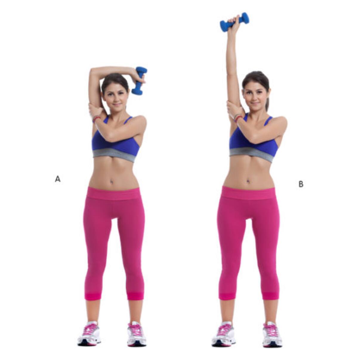 De pie, sujeta la mancuerna, o una botella con agua, con una mano y eleva el brazo llevando el peso por detrás de la cabeza.