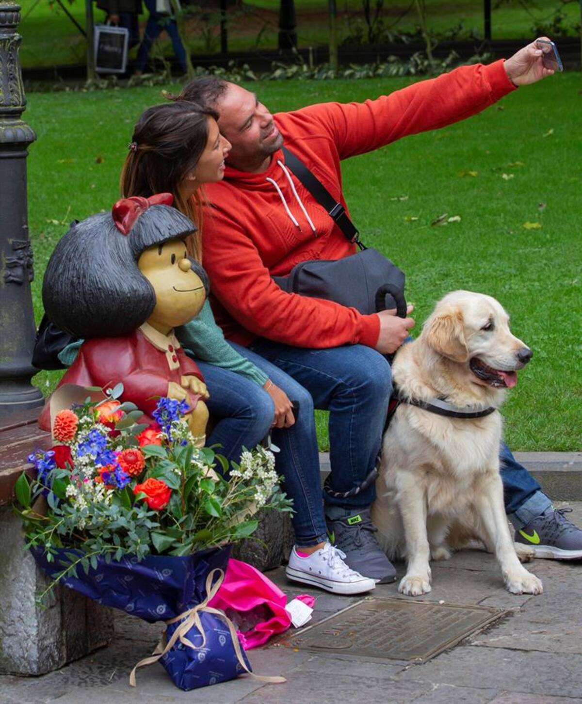Cualquier domingo o día festivo es normal ver una larga fila de gente en este barrio esperando para sacarse una foto en el famoso bando donde siempre están Mafalda, Manolito y Susanita, posiblemente hablando sobre los problemas de un mundo con los que ella nunca se sintió conforme.